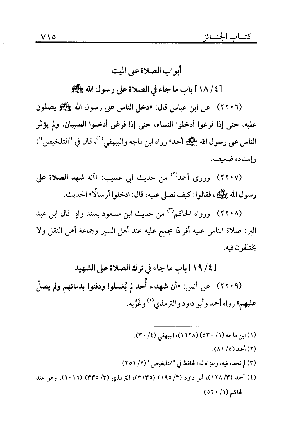 2209 - عن أنس: «شهداء أُحد لم يُغسلوا ودفنوا بدمائهم ولم يصلّ عليهم» رواه أحمد وأبو داود والترمذي (¬4) وغَرَّبه.