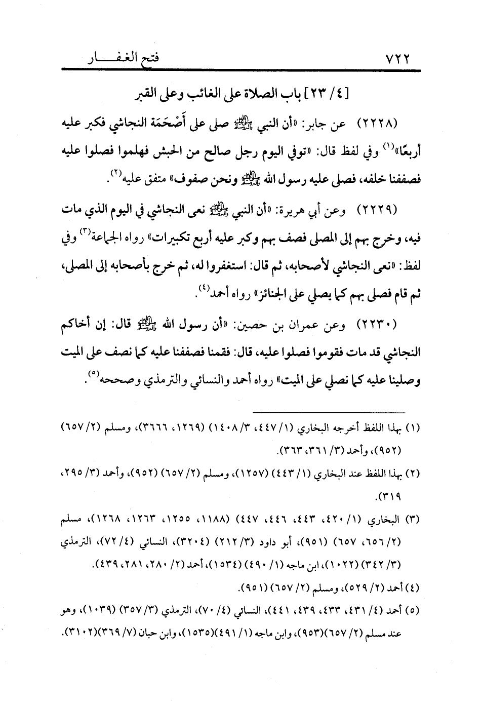 2228 - عن جابر: «أن النبي - صلى الله عليه وسلم - صلى على أَصْحَمَة النجاشي فكبر عليه أربعًا» (¬1) وفي لفظ قال: «توفي اليوم رجل صالح من الحبش فهلموا فصلوا عليه فصففنا خلفه، فصلى عليه رسول الله - صلى الله عليه وسلم - ونحن صفوف» متفق عليه (¬2) .
