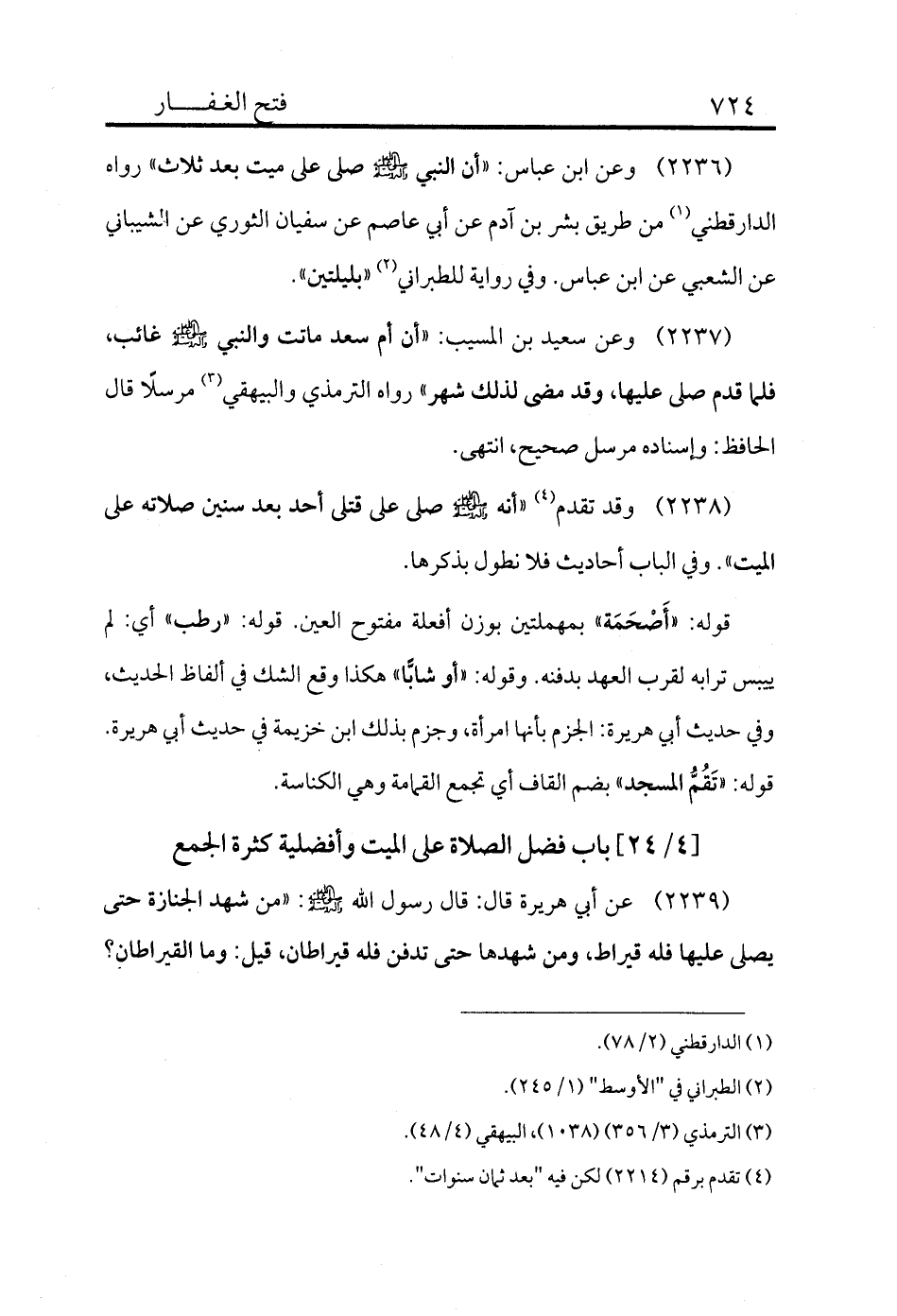 2236 - وعن ابن عباس: «أن النبي - صلى الله عليه وسلم - صلى على ميت بعد ثلاث» رواه الدارقطني (¬1) من طريق بشر بن آدم عن أبي عاصم عن سفيان الثوري عن الشيباني عن الشعبي عن ابن عباس. وفي رواية للطبراني (¬2) «بليلتين» .