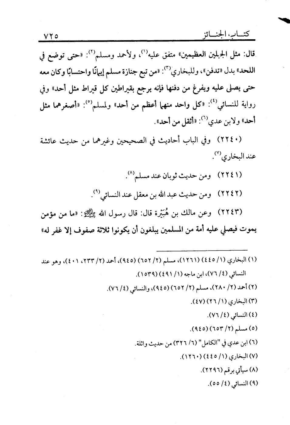 2243 - وعن مالك بن هُبَيْرة قال: قال رسول الله - صلى الله عليه وسلم -: «ما من مؤمن يموت فيصلي عليه أمة من المسلمين يبلغون أن يكونوا ثلاثة صفوف إلا غفر له»