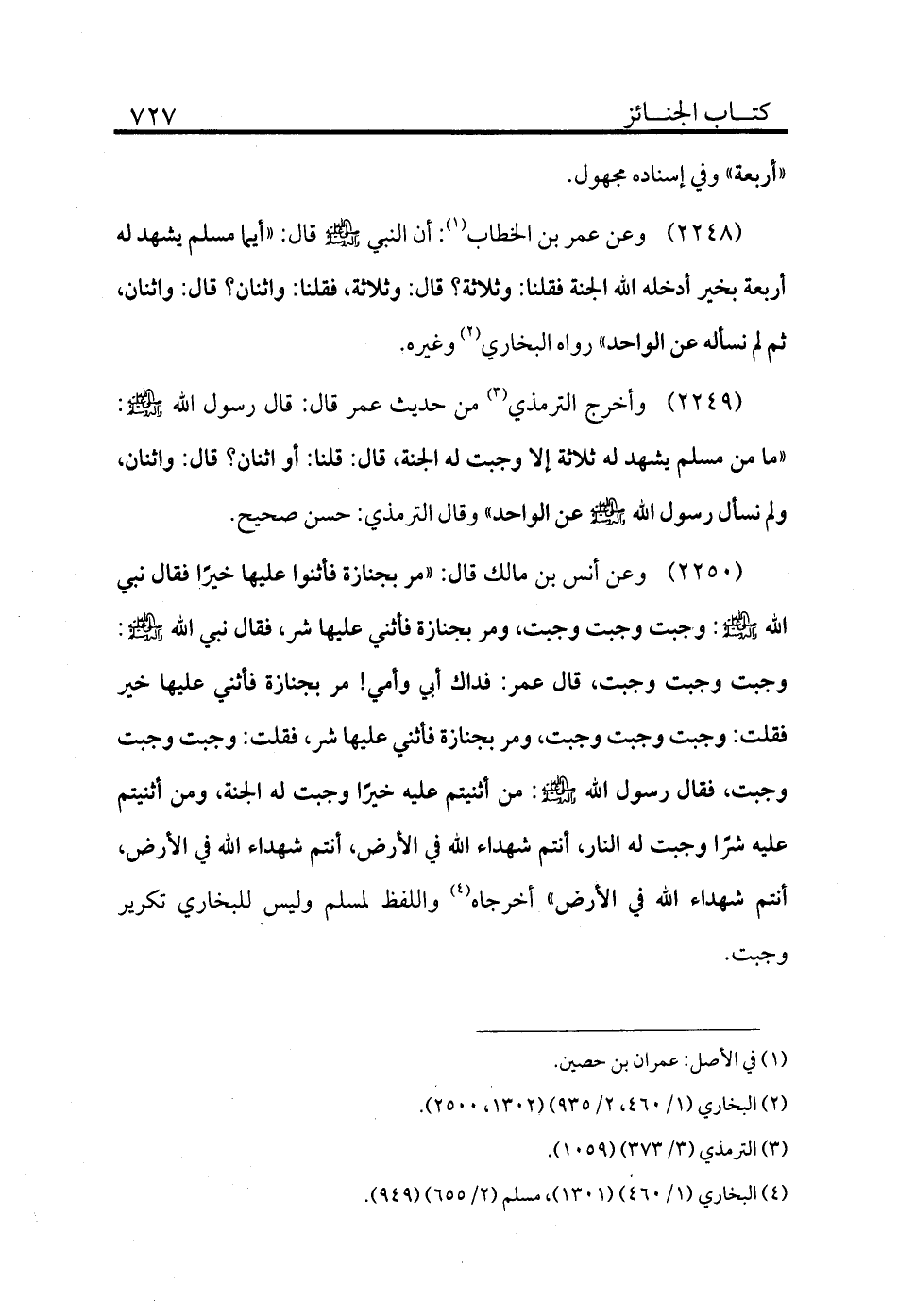 2248 - وعن عمر بن الخطاب (¬1) : أن النبي - صلى الله عليه وسلم - قال: «أيما مسلم يشهد له أربعة بخير أدخله الله الجنة فقلنا: وثلاثة؟ قال: وثلاثة، فقلنا: واثنان؟ قال: واثنان، ثم لم نسأله عن الواحد» رواه البخاري (¬2) وغيره.
