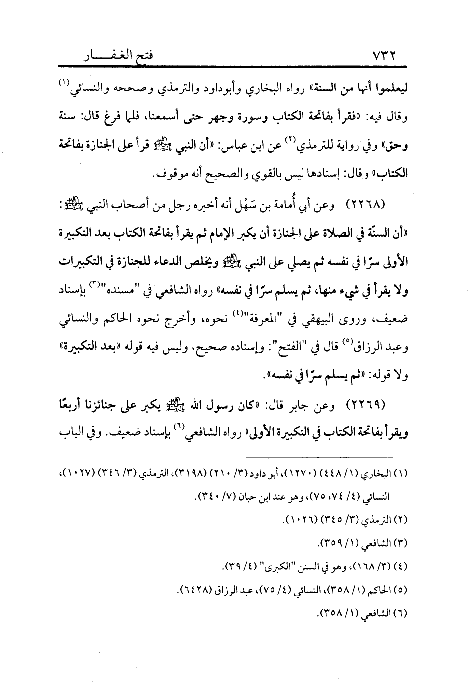 2269 - وعن جابر قال: «كان رسول الله - صلى الله عليه وسلم - يكبر على جنائزنا أربعًا ويقرأ بفاتحة الكتاب في التكبيرة الأولى» رواه الشافعي (¬6) بإسناد ضعيف. وفي الباب