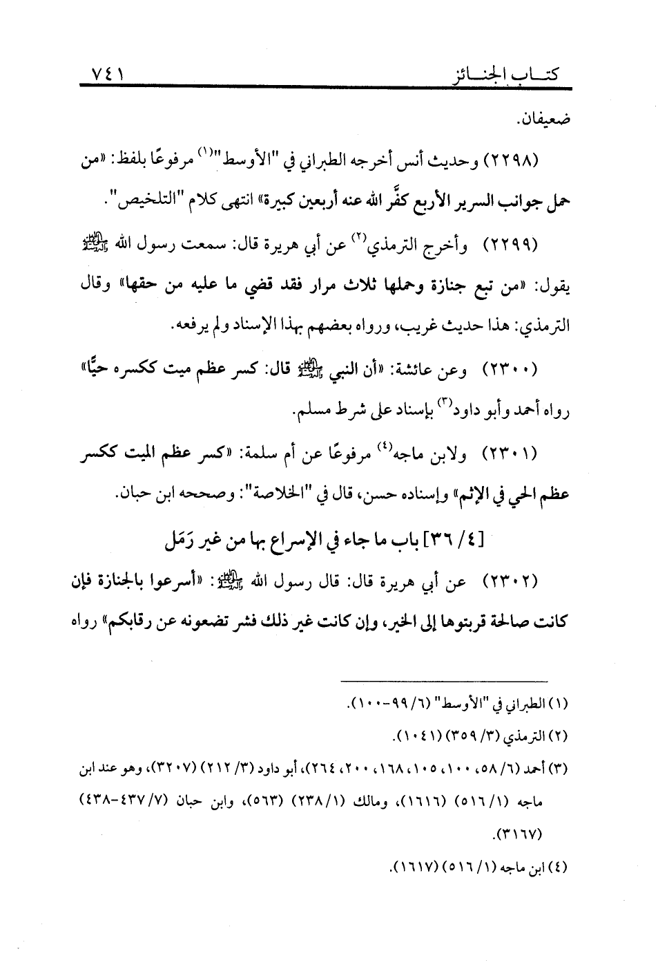 2302 - عن أبي هريرة قال: قال رسول الله - صلى الله عليه وسلم -: «أسرعوا بالجنازة فإن كانت صالحة قربتوها إلى الخير وإن كانت غير ذلك فشر تضعونه عن رقابكم» رواه