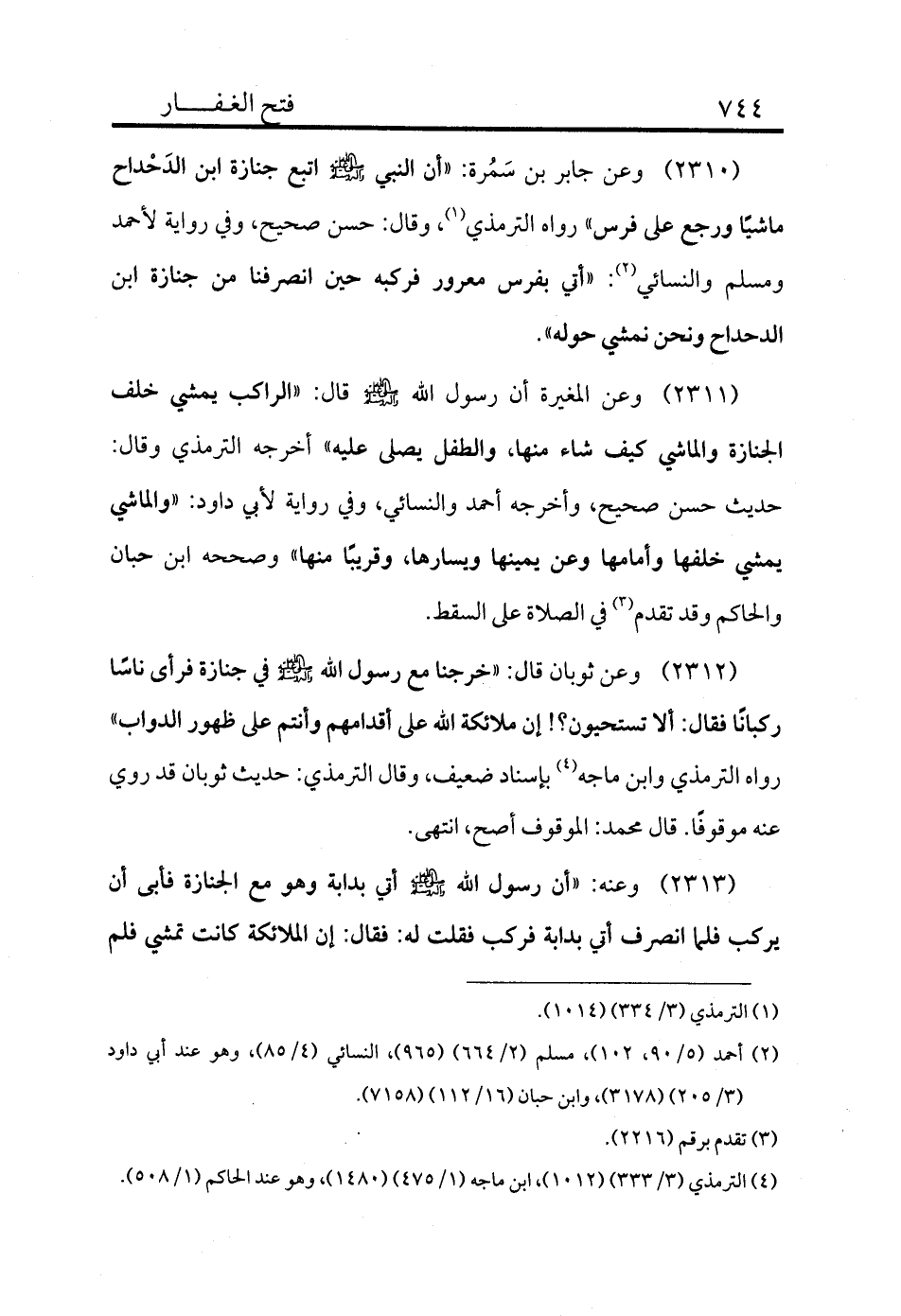 2310 - وعن جابر بن سَمُرة: «أن النبي - صلى الله عليه وسلم - اتبع جنازة ابن الدَحْداح ماشيًا ورجع على فرس» رواه الترمذي (¬1) ، وقال: حسن صحيح، وفي رواية لأحمد ومسلم والنسائي (¬2) : «أتي بفرس معرور فركبه حين انصرفنا من جنازة ابن الدحداح ونحن نمشي حوله» .