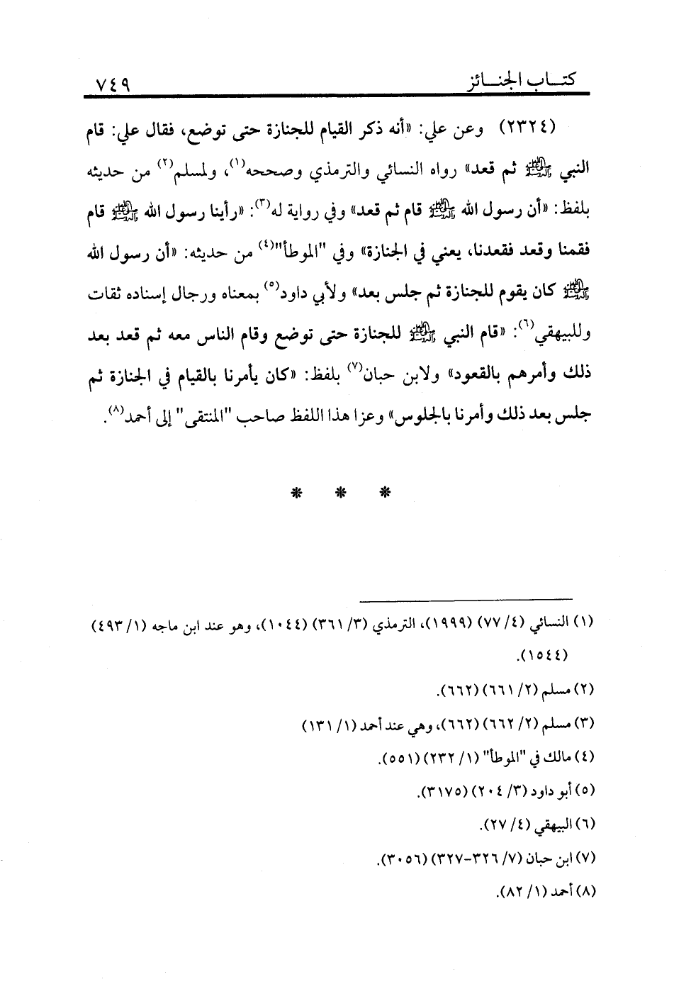 2324 - وعن علي: «أنه ذكر القيام للجنازة حتى توضع، فقال علي: قام النبي - صلى الله عليه وسلم - ثم قعد» رواه النسائي والترمذي وصححه (¬1) ، ولمسلم (¬2) من حديثه بلفظ: «أن رسول الله - صلى الله عليه وسلم - قام ثم قعد» وفي رواية له (¬3) : «رأينا رسول الله - صلى الله عليه وسلم - قام فقمنا وقعد فقعدنا، يعني في الجنازة» وفي "الموطأ" (¬4) من حديثه: «أن رسول الله - صلى الله عليه وسلم - كان يقوم للجنازة ثم جلس بعد» ولأبي داود (¬5) بمعناه ورجال إسناده ثقات وللبيهقي (¬6) : «قام النبي - صلى الله عليه وسلم - للجنازة حتى توضع وقام الناس معه ثم قعد بعد ذلك وأمرهم بالقعود» ولابن حبان (¬7) بلفظ: «كان يأمرنا بالقيام في الجنازة ثم جلس بعد ذلك وأمرنا بالجلوس» وعزا هذا اللفظ صاحب "المنتقى" إلى أحمد (¬8) .