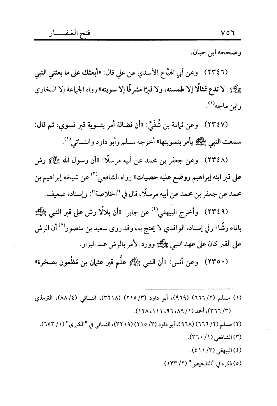 2347 - وعن ثمامة بن شُفَيٍّ: «أن فضالة أمر بتسوية قبر فسوي، ثم قال: سمعت النبي - صلى الله عليه وسلم - يأمر بتسويتها» أخرجه مسلم وأبو داود والنسائي (¬2) .