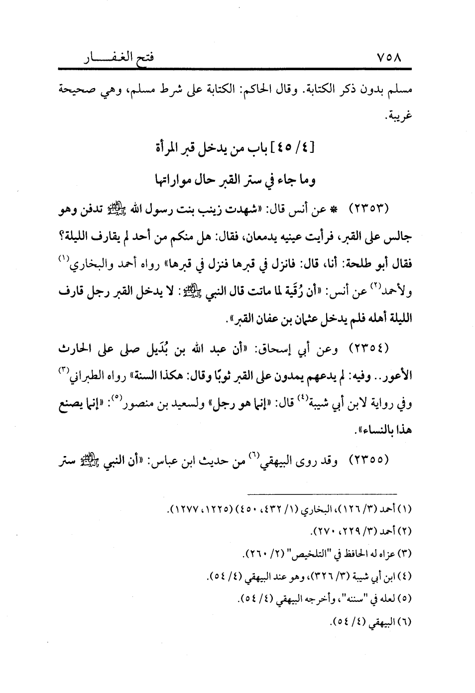 2353 - عن أنس قال: «شهدت زينب (*) بنت رسول الله - صلى الله عليه وسلم - تدفن وهو جالس على القبر، فرأيت عينيه يدمعان، فقال: هل منكم من أحد لم يقارف الليلة؟ فقال أبو طلحة: أنا، قال: فانزل في قبرها فنزل في قبرها» رواه أحمد والبخاري (¬1) ولأحمد (¬2) عن أنس: «أن رُقَية لما ماتت قال النبي - صلى الله عليه وسلم -: لا يدخل القبر رجل قارف الليلة أهله فلم يدخل عثمان بن عفان القبر» .