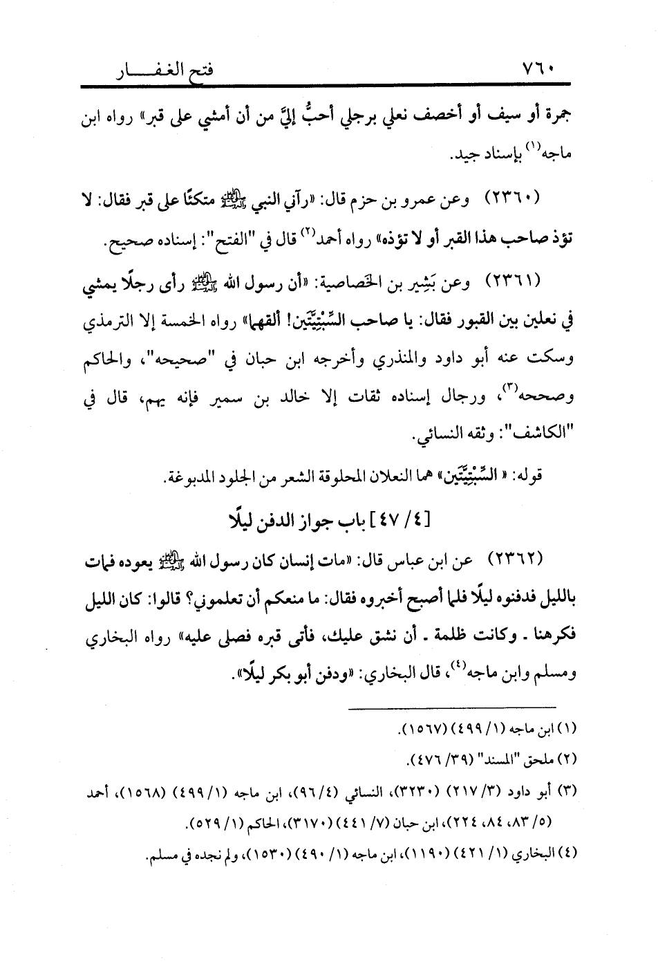 2360 - وعن عمرو بن حزم قال: «رآني النبي - صلى الله عليه وسلم - متكئًا على قبر فقال: لا تؤذ صاحب هذا القبر أو لا تؤذه» رواه أحمد (¬2) قال في "الفتح": إسناده صحيح.