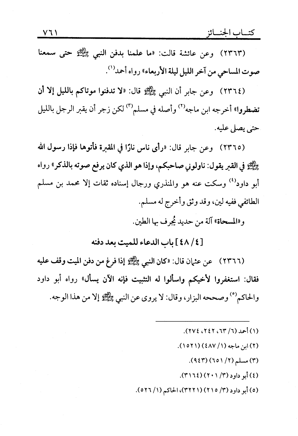 2363 - وعن عائشة قالت: «ما علمنا بدفن النبي - صلى الله عليه وسلم - حتى سمعنا صوت المساحي من آخر الليل ليلة الأربعاء» رواه أحمد (¬1) .