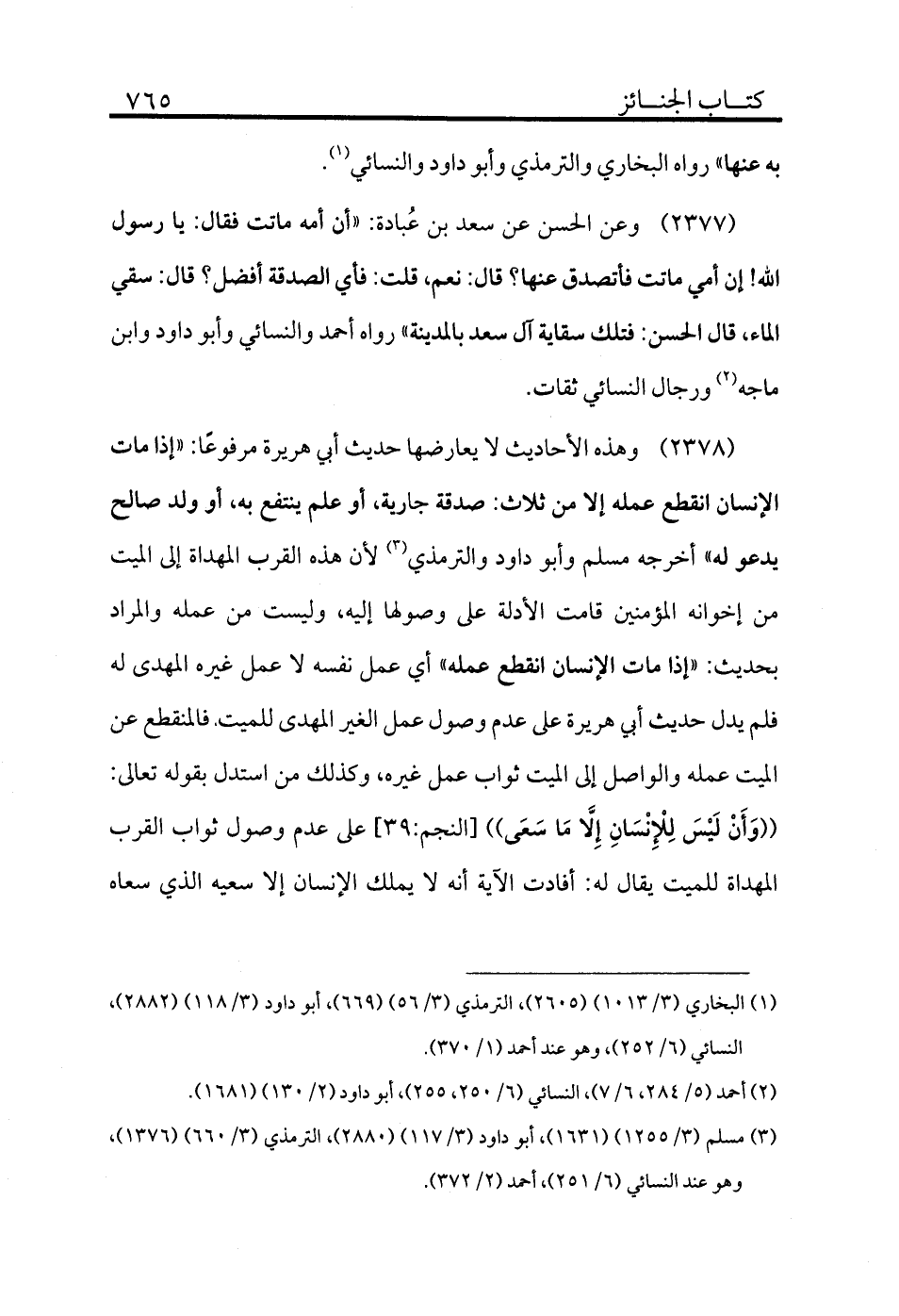 2377 - وعن الحسن عن سعد بن عُبادة: «أن أمه ماتت فقال: يا رسول الله! إن أمي ماتت فأتصدق عنها؟ قال: نعم، قلت: فأي الصدقة أفضل؟ قال: سقي الماء، قال الحسن: فتلك سقاية آل سعد بالمدينة» رواه أحمد والنسائي وأبو داود وابن ماجه (¬2) ورجال النسائي ثقات.