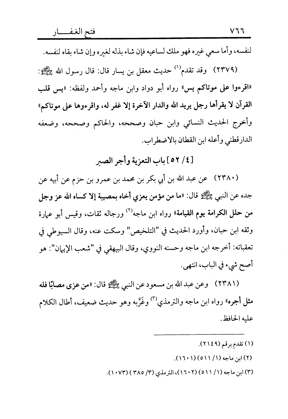 2381 - وعن عبد الله بن مسعود عن النبي - صلى الله عليه وسلم - قال: «من عزى مصابًا فله مثل أجره» رواه ابن ماجه والترمذي (¬3) وغَرَّبه وهو حديث ضعيف، أطال الكلام عليه الحافظ.