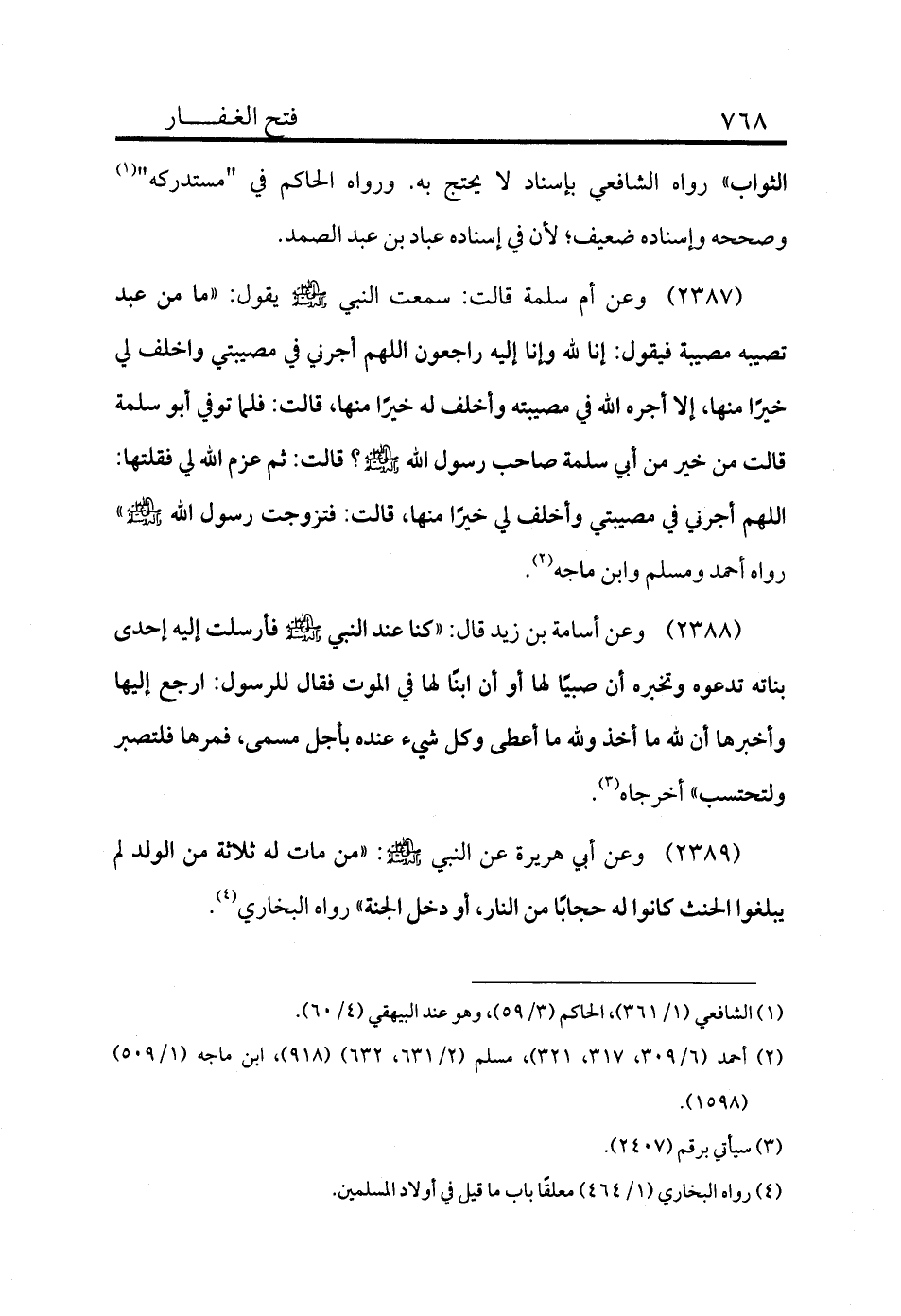 2389 - وعن أبي هريرة عن النبي - صلى الله عليه وسلم -: «من مات له ثلاثة من الولد لم يبلغوا الحنث كانوا له حجابًا من النار، أو دخل الجنة» رواه البخاري (¬4) .