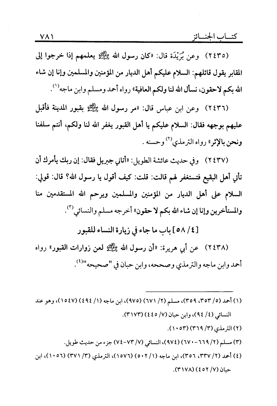 2438 - عن أبي هريرة: «أن رسول الله - صلى الله عليه وسلم - لعن زوارات القبور» رواه أحمد وابن ماجه والترمذي وصححه، وابن حبان في "صحيحه" (¬4) .