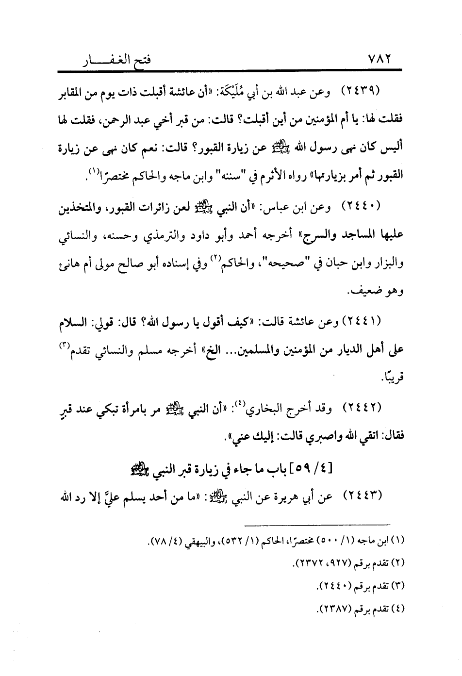 2441 - وعن عائشة قالت: «كيف أقول يا رسول الله؟ قال: قولي: السلام على أهل الديار من المؤمنين والمسلمين ... الخ» أخرجه مسلم والنسائي تقدم (¬3) قريبًا.