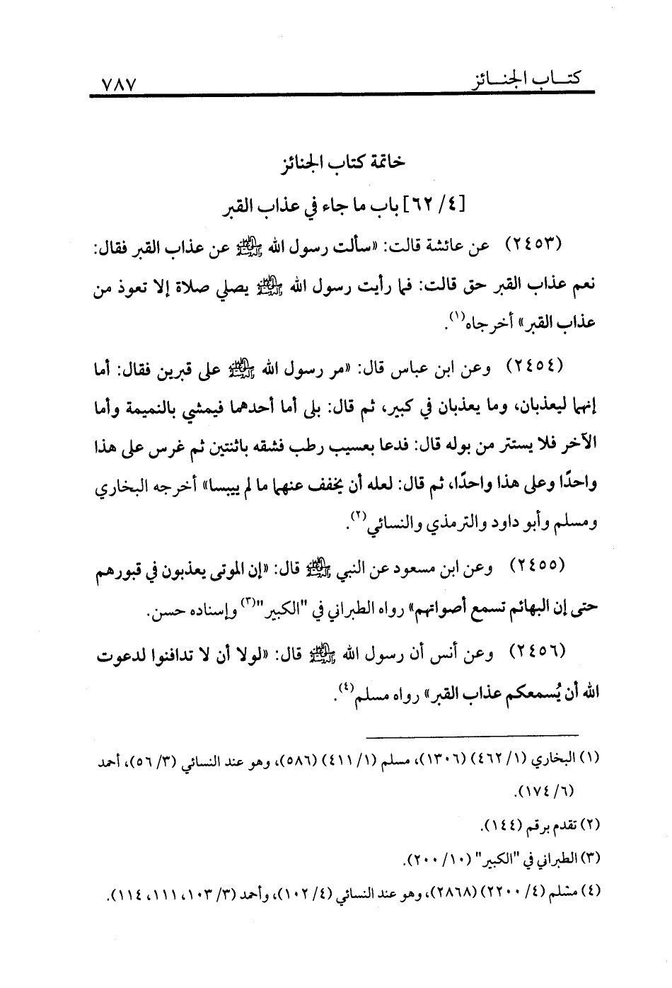 2455 - وعن ابن مسعود عن النبي - صلى الله عليه وسلم - قال: «إن الموتى يعذبون في قبورهم حتى إن البهائم تسمع أصواتهم» رواه الطبراني في "الكبير" (¬3) وإسناده حسن.