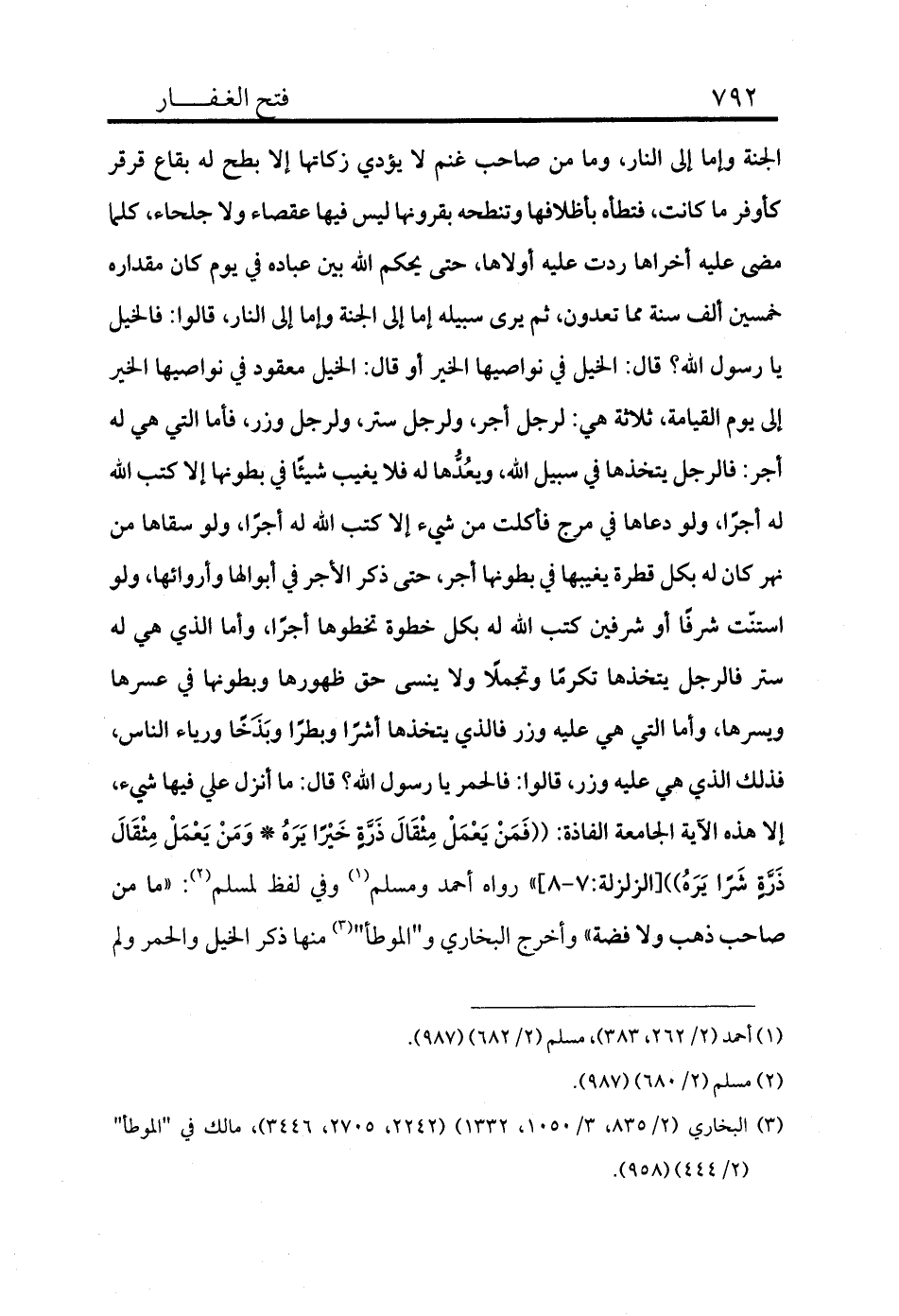الجنة وإما إلى النار، وما من صاحب غنم لا يؤدي زكاتها إلا بطح له بقاع قرقر كأوفر ما كانت، فتطأه بأظلافها وتنطحه بقرونها ليس فيها عَقْصًا ولا جلحًا، كلما مضى عليه أخراها ردت عليه أولاها، حتى يحكم الله بين عباده في يوم كان مقداره خمسين ألف سنة مما تعدون، ثم يرى سبيله إما إلى الجنة وإما إلى النار، قالوا: فالخيل يا رسول الله؟ قال: الخيل في نواصيها الخير أو قال: الخيل معقود في نواصيها الخير إلى يوم القيامة، ثلاثة هي: لرجل أجر، ولرجل ستر، ولرجل وزر، فأما التي هي له أجر: فالرجل يتخذها في سبيل الله، ويعُدُّها له فلا يغيب شيئًا في بطونها إلا كتب الله له أجرًا، ولو دعاها في مرج فأكلت من شيء إلا كتب الله له أجرًا، ولو سقاها من نهر كان له بكل قطرة يغيبها في بطونها أجر، حتى ذكر الأجر في أبوالها وأروائها، ولو استنّت شرفًا أو شرفين كتب الله له بكل خطوة تخطوها أجرًا، وأما الذي هي له ستر فالرجل يتخذها تكرمًا وتجملًا ولا ينسى حق ظهورها وبطونها في عسرها ويسرها، وأما التي هي عليه وزر فالذي يتخذها أشرًا وبطرًا وبَذْخًا ورياء الناس، فذلك الذي هي عليه وزر، قالوا: فالحمر يا رسول الله؟ قال: ما أنزل علي فيها شيء، إلا هذه الآية الجامعة الفاذة: ((فَمَنْ يَعْمَلْ مِثْقَالَ ذَرَّةٍ خَيْرًا يَرَهُ * وَمَنْ يَعْمَلْ مِثْقَالَ ذَرَّةٍ شَرًا يَرَهُ)) [الزلزلة:7-8] » رواه أحمد