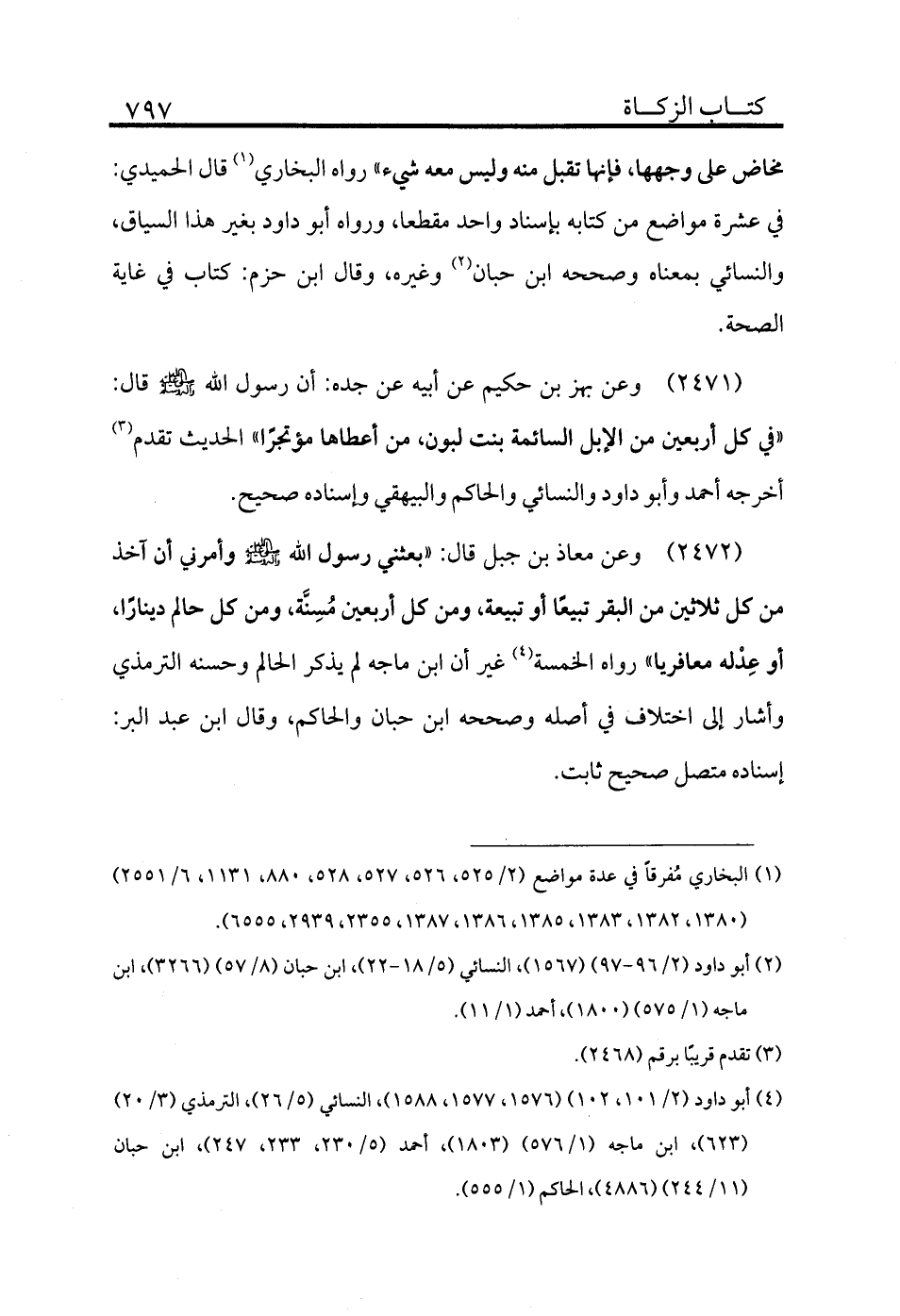 2471 - وعن بهز بن حكيم عن أبيه عن جده: أن رسول الله - صلى الله عليه وسلم - قال: «في كل أربعين من الإبل السائمة بنت لبون، من أعطى مؤتجرًا» الحديث تقدم (¬3) أخرجه أحمد وأبو داود والنسائي والحاكم والبيهقي وإسناده صحيح.