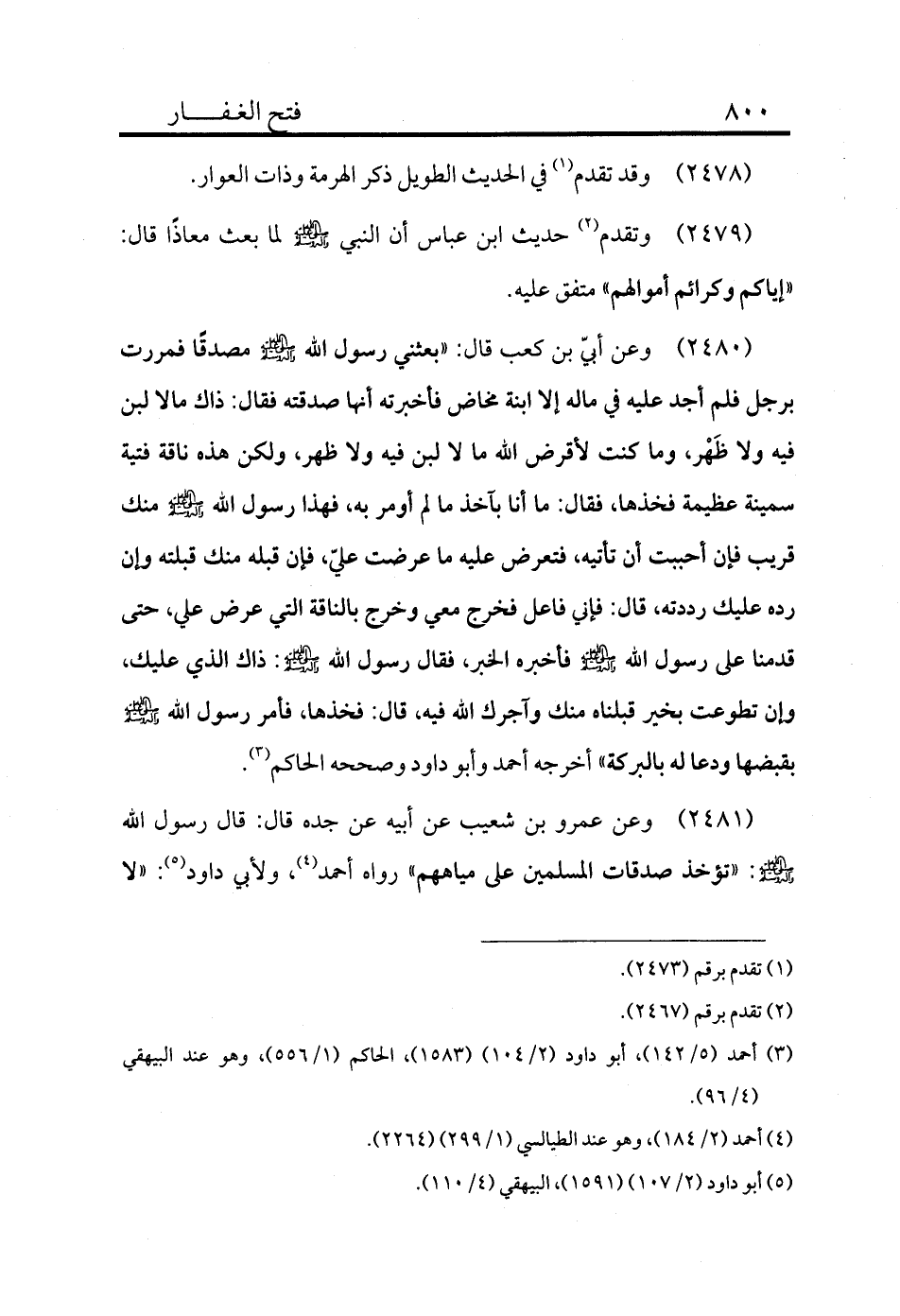 2481 - وعن عمرو بن شعيب عن أبيه عن جده قال: قال رسول الله - صلى الله عليه وسلم -: «تؤخذ صدقات المسلمين على مياههم» رواه أحمد (¬4) ، ولأبي داود (¬5) : «لا