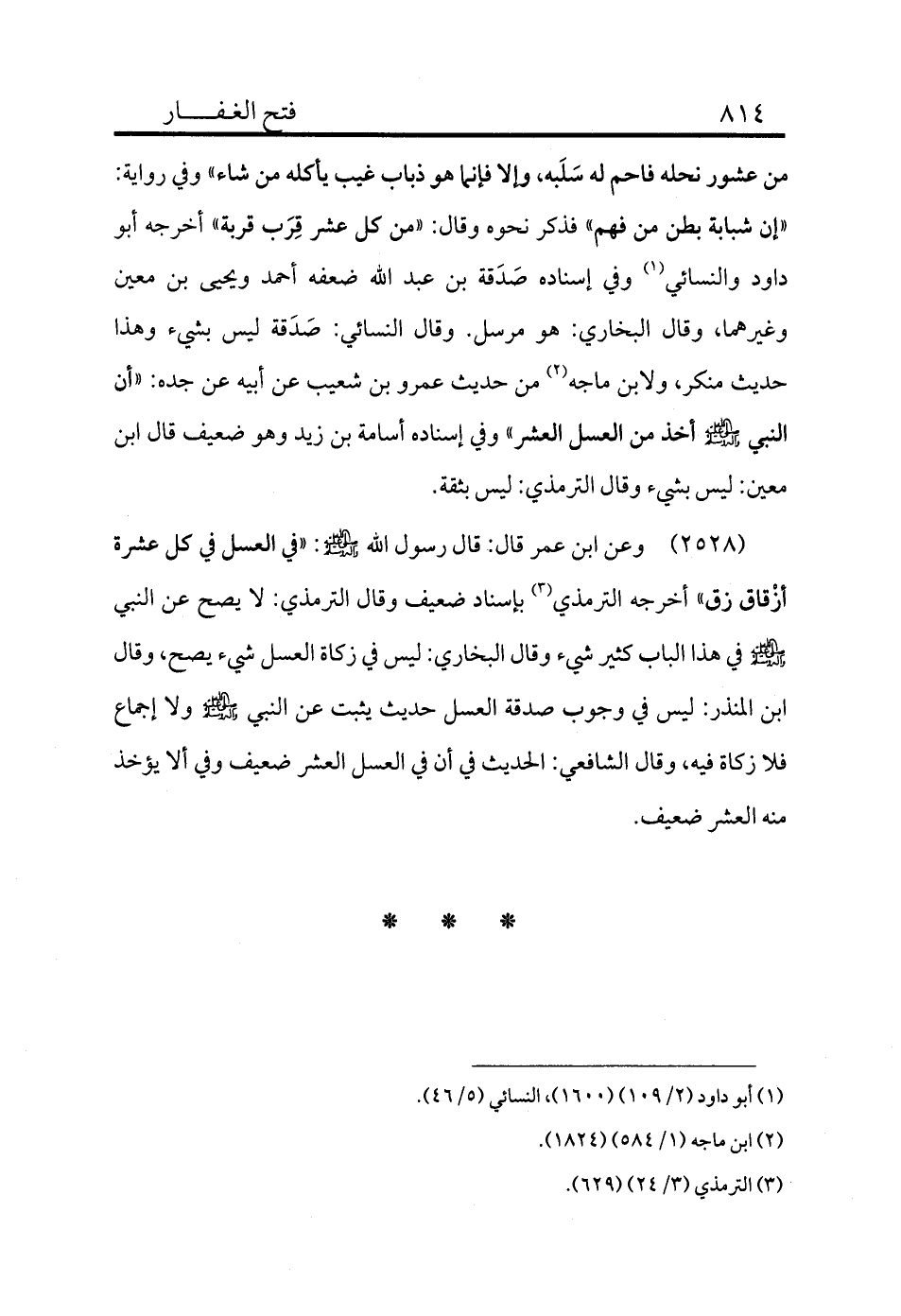 2528 - وعن ابن عمر قال: قال رسول الله - صلى الله عليه وسلم -: «في العسل في كل عشرة أزْقاق زق» أخرجه الترمذي (¬3) بإسناد ضعيف وقال الترمذي: لا يصح عن النبي - صلى الله عليه وسلم - في هذا الباب كثير شيء وقال البخاري: ليس في زكاة العسل شيء يصح، وقال ابن المنذر: ليس في وجوب صدقة العسل حديث يثبت عن النبي - صلى الله عليه وسلم - ولا إجماع فلا زكاة فيه، وقال الشافعي: الحديث في أن في العسل العشر ضعيف وفي ألا يؤخذ منه العشر ضعيف.
