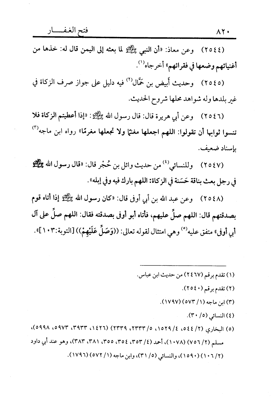 2548 - وعن عبد الله بن أبي أوفى قال: «كان رسول الله - صلى الله عليه وسلم - إذا أتاه قوم بصدقتهم قال: اللهم صلِّ عليهم، فأتاه أبو أوفى بصدقته فقال: اللهم صلِّ على آل أبي أوفى» متفق عليه (¬5) وهي امتثال لقوله تعالى: ((وَصَلِّ عَلَيْهِمْ)) [التوبة:103] » .