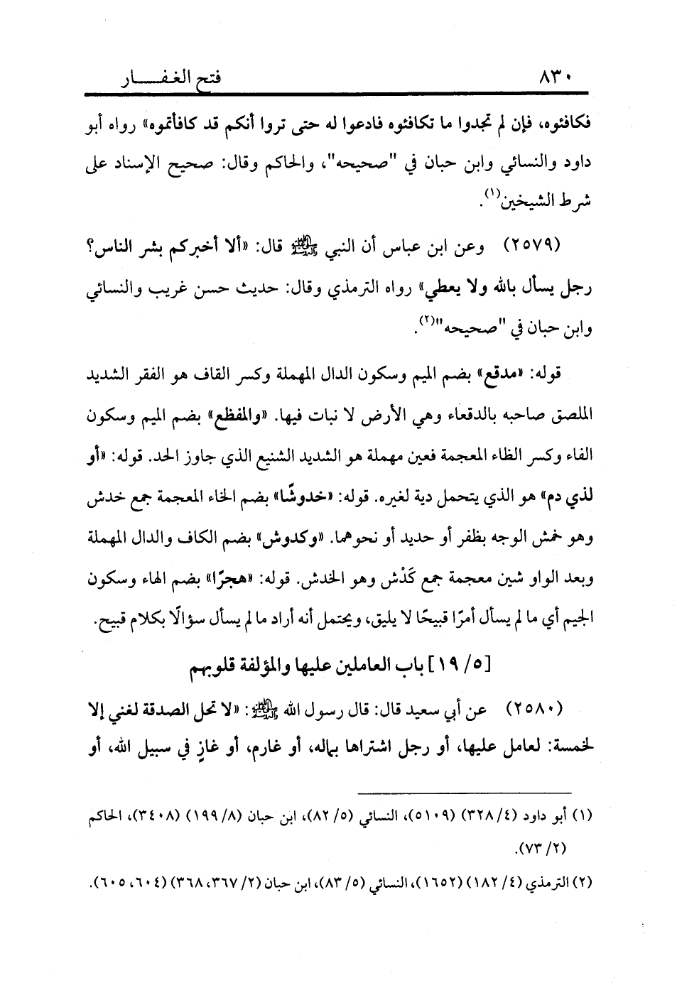 قوله: «مدقع» بضم الميم وسكون الدال المهملة وكسر القاف هو الفقر الشديد الملصق صاحبه بالدقعاء وهي الأرض لا نبات فيها. «والمفظع» بضم الميم وسكون الفاء وكسر الظاء المعجمة فعين مهملة هو الشديد الشنيع الذي جاوز الحد. قوله: «أو لذي دم» هو الذي يتحمل دية لغيره. قوله: «خدوشًا» بضم الخاء المعجمة جمع خدش وهو خمش الوجه بظفر أو حديد أو نحوهما. «وكدوش» بضم الكاف والدال المهملة وبعد الواو شين معجمة جمع كَدْش وهو الخدش. قوله: «هجرًا» بضم الهاء وسكون الجيم أي ما لم يسأل أمرًا قبيحًا لا يليق، ويحتمل أنه أراد ما لم يسأل سؤالًا بكلام قبيح.