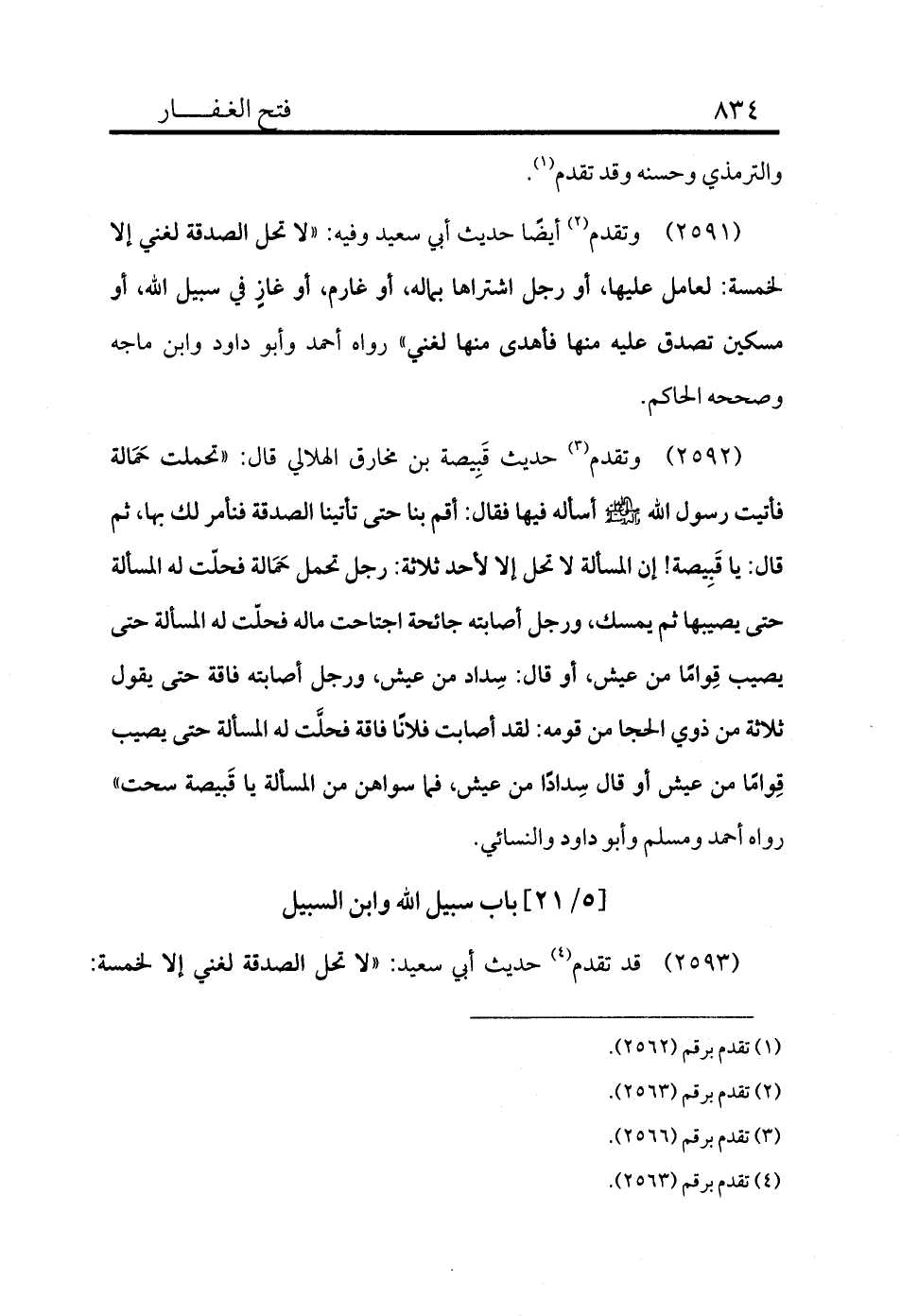 2591 - وتقدم (¬2) أيضًا حديث أبي سعيد وفيه: «لا تحل الصدقة لغني إلا لخمسة: لعامل عليها أو رجل اشتراها بماله أو غارم أو غاز في سبيل الله، أو مسكين تصدق عليه منها فأهدى منها لغني» رواه أحمد وأبو داود وابن ماجه وصححه الحاكم.