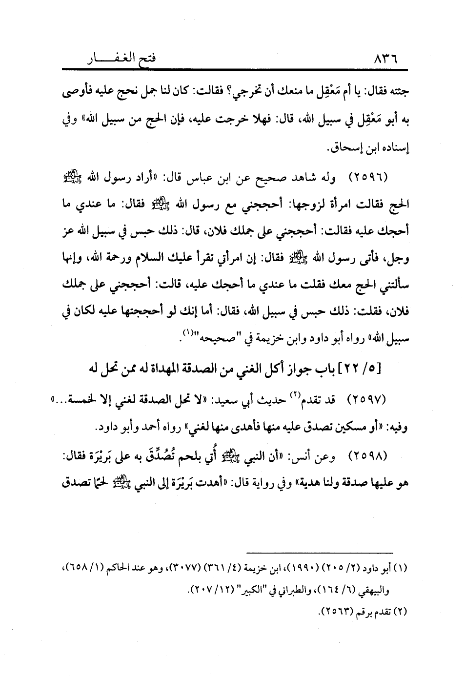 2596 - وله شاهد صحيح عن ابن عباس قال: «أراد رسول الله - صلى الله عليه وسلم - الحج فقالت امرأة لزوجها: أحججني مع رسول الله - صلى الله عليه وسلم - فقال: ما عندي ما أحجك عليه فقالت: أحججني على جملك فلان، قال: ذلك حبس في سبيل الله عز وجل، فأتى رسول الله - صلى الله عليه وسلم - فقال: إن امرأتي تقرأ عليك السلام ورحمة الله، وإنها سألتني الحج معك فقلت ما عندي ما أحجك عليه، قالت: أحججني على جملك فلان، فقلت: ذلك حبس في سبيل الله، فقال: أما إنك لو أحججتها عليه لكان في سبيل الله» رواه أبو داود وابن خزيمة في "صحيحه" (¬1) .