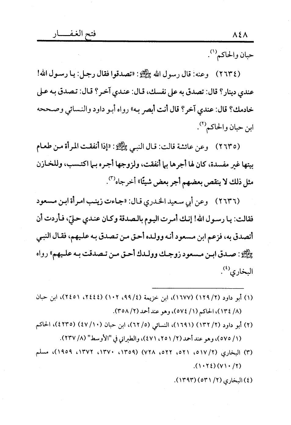 2634 - وعنه: قال رسول الله - صلى الله عليه وسلم -: «تصدقوا فقال رجل: يا رسول الله! عندي دينار؟ قال: تصدق به على نفسك، قال: عندي آخر؟ قال: تصدق به على خادمك؟ قال: عندي آخر؟ قال أنت أبصر به» رواه أبو داود والنسائي وصححه ابن حبان والحاكم (¬2) .