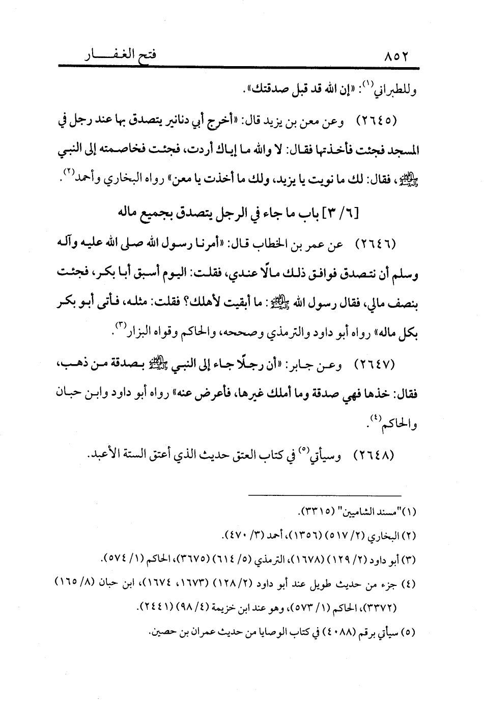 2646 - عن عمر بن الخطاب قال: «أمرنا رسول الله صلى الله عليه وسلم أن نتصدق فوافق ذلك مالًا عندي، فقلت: اليوم أسبق أبا بكر، فجئت بنصف مالي، فقال رسول الله - صلى الله عليه وسلم -: ما أبقيت لأهلك؟ فقلت: مثله، فأتى أبو بكر بكل ماله» رواه أبو داود والترمذي وصححه، والحاكم وقواه البزار (¬3) .