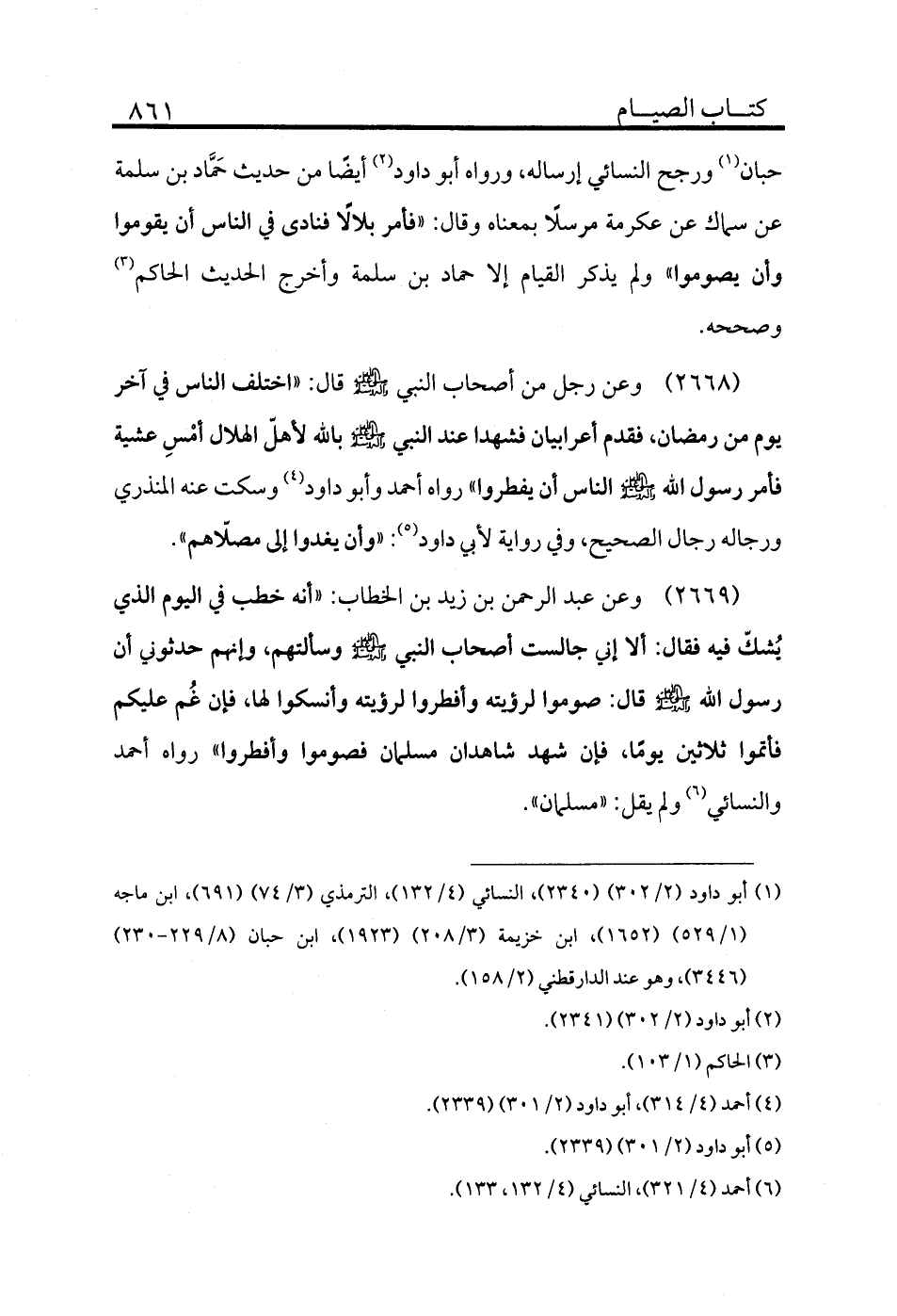 2668 - وعن رجل من أصحاب النبي - صلى الله عليه وسلم - قال: «اختلف الناس في آخر يوم من رمضان، فقدم أعرابيان فشهدا عند النبي - صلى الله عليه وسلم - بالله لأهلّ الهلال أمْسِ عشية فأمر رسول الله - صلى الله عليه وسلم - الناس أن يفطروا» رواه أحمد وأبو داود (¬4) وسكت عنه المنذري ورجاله رجال الصحيح، وفي رواية لأبي داود (¬5) : «وأن يغدوا إلى مصلّاهم» .