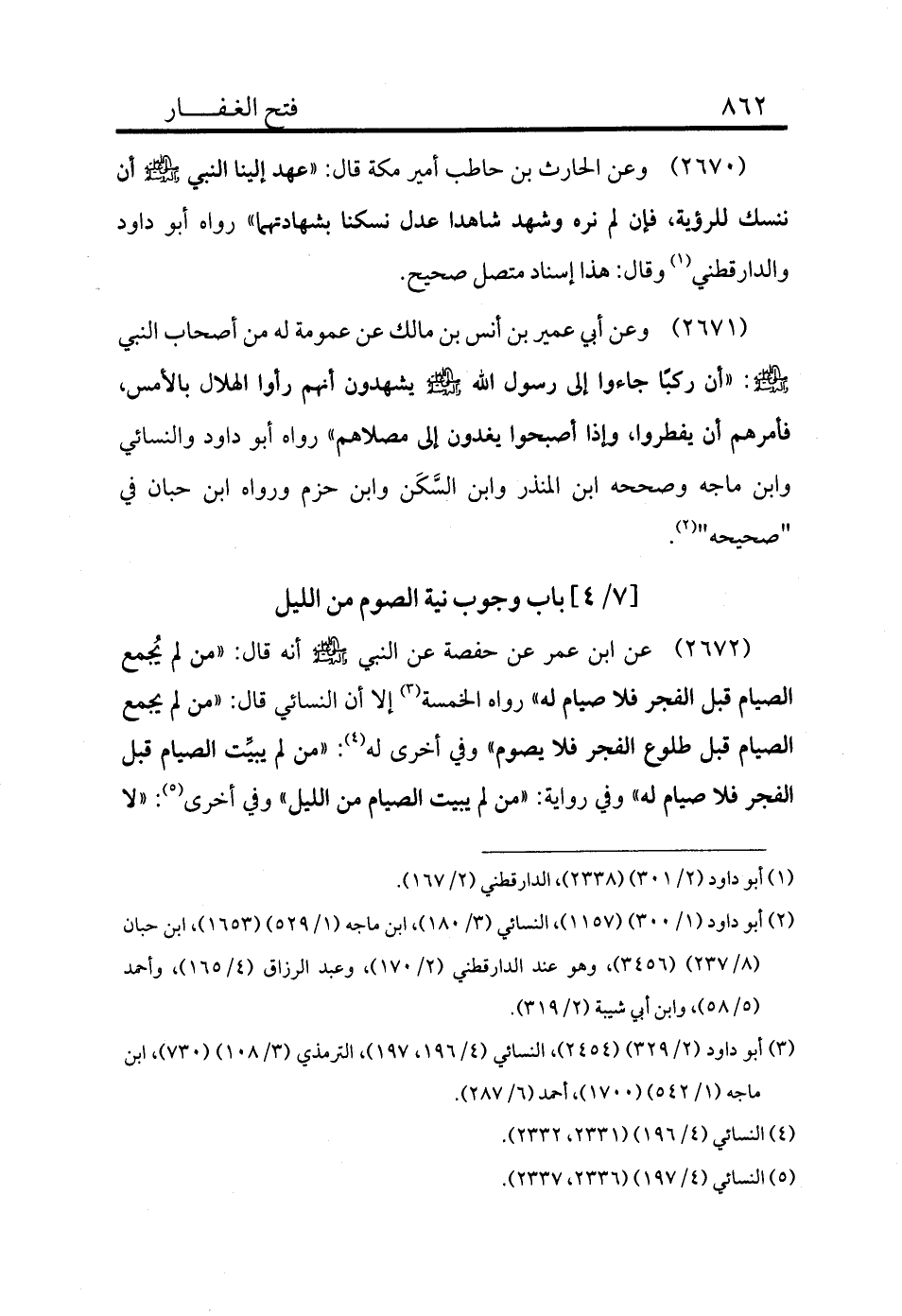 2672 - عن ابن عمر عن حفصة عن النبي - صلى الله عليه وسلم - أنه قال: «من لم يُجمع الصيام قبل الفجر فلا صيام له» رواه الخمسة (¬3) إلا أن النسائي قال: «من لم يجمع الصيام قبل طلوع الفجر فلا يصوم» وفي أخرى له (¬4) : «من لم يبيِّت الصيام قبل الفجر فلا صيام له» وفي أخرى (¬5) : «لا