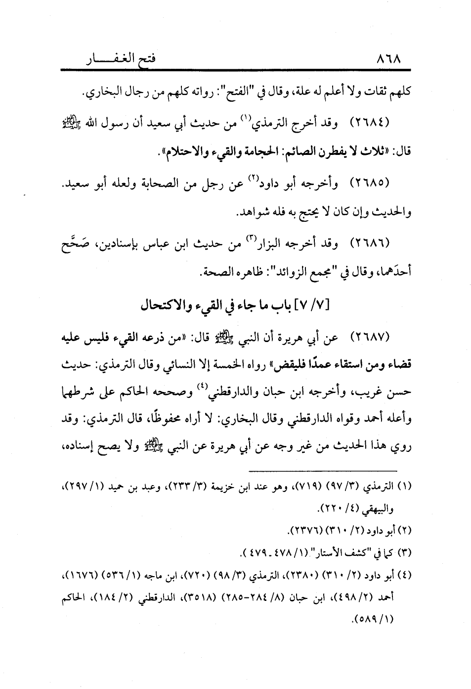 2684 - وقد أخرج الترمذي (¬1) من حديث أبي سعيد أن رسول الله - صلى الله عليه وسلم - قال: «ثلاث لا يفطرن الصائم: الحجامة والقيء والاحتلام» .