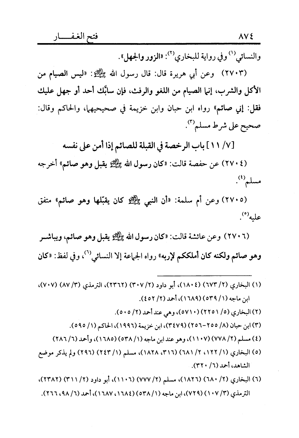 2704 - عن حفصة قالت: «كان رسول الله - صلى الله عليه وسلم - يقبل وهو صائم» أخرجه مسلم (¬4) .