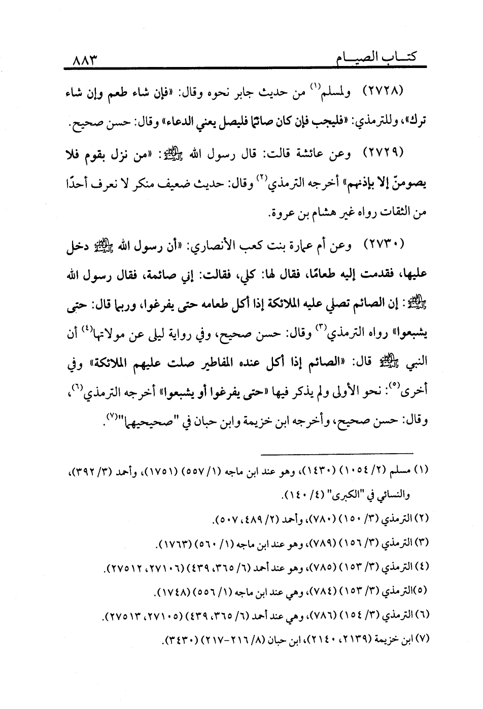 2730 - وعن أم عمارة بنت كعب الأنصاري: «أن رسول الله - صلى الله عليه وسلم - دخل عليها، فقدمت إليه طعامًا، فقال لها: كلي، فقالت: إني صائمة، فقال رسول الله - صلى الله عليه وسلم -: إن الصائم تصلي عليه الملائكة إذا أكل طعامه حتى يفرغوا، وربما قال: حتى يشبعوا» رواه الترمذي (¬3) وقال: حسن صحيح، وفي رواية ليلى عن مولاتها (¬4) أن النبي - صلى الله عليه وسلم - قال: «الصائم إذا أكل عنده المفاطير صلت عليهم الملائكة» وفي أخرى (¬5) : نحو الأولى ولم يذكر فيها «حتى يفرغوا أو يشبعوا» أخرجه الترمذي (¬6) ، وقال: حسن صحيح، وأخرجه ابن خزيمة وابن حبان في "صحيحيهما" (¬7) .