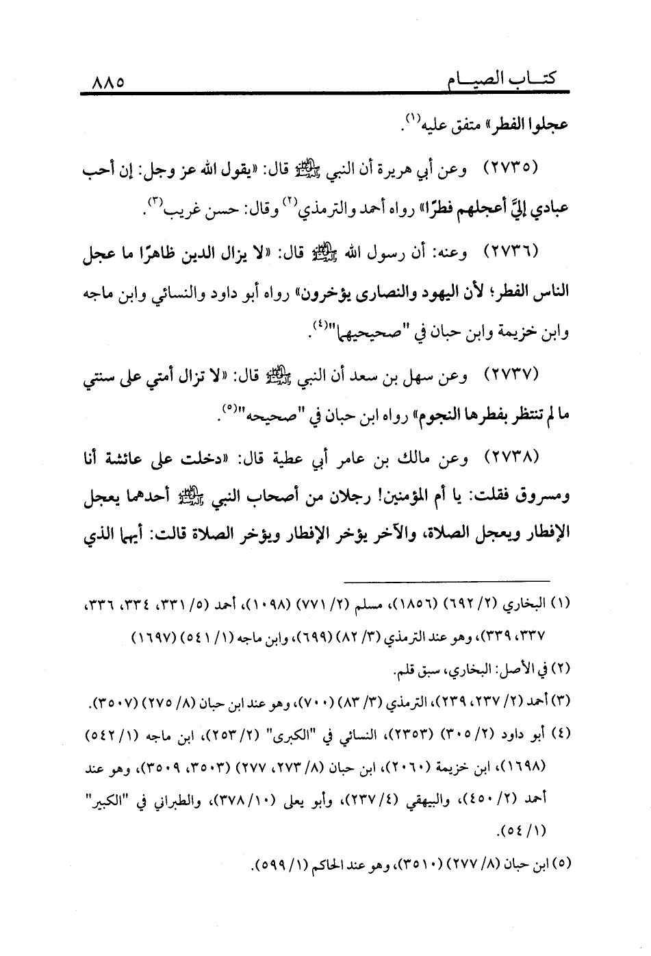 2737 - وعن سهل بن سعد أن النبي - صلى الله عليه وسلم - قال: «لا تزال أمتي على سنتي ما لم تنتظر بفطرها النجوم» رواه ابن حبان في "صحيحه" (¬5) .