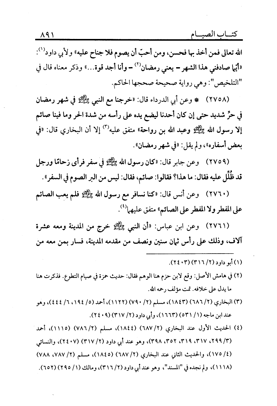 2760 - وعن أنس قال: «كنا نسافر مع رسول الله - صلى الله عليه وسلم - فلم يعب الصائم على المفطر ولا المفطر على الصائم» متفق عليهما (¬3) .