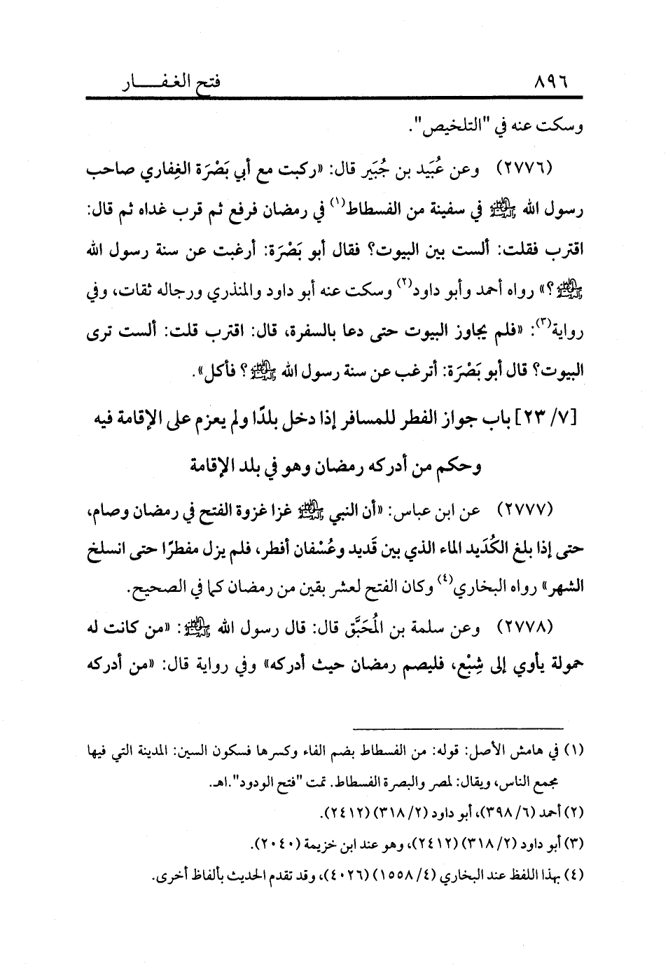 2776 - وعن عُبَيد بن جُبَير قال: «ركبت مع أبي بَصْرَة الغِفاري صاحب رسول الله - صلى الله عليه وسلم - في سفينة من الفسطاط (¬1) في رمضان فرفع ثم قرب غداه ثم قال: اقترب فقلت: ألست بين البيوت؟ فقال أبو بَصْرَة: أرغبت عن سنة رسول الله - صلى الله عليه وسلم -؟» رواه أحمد وأبو داود (¬2) وسكت عنه أبو داود والمنذري ورجاله ثقات، وفي رواية (¬3) : «فلم يجاوز البيوت حتى دعا بالسفرة، قال: اقترب قلت: ألست ترى البيوت؟ قال أبو بَصْرَة: أترغب عن سنة رسول الله - صلى الله عليه وسلم -؟ فأكل» .