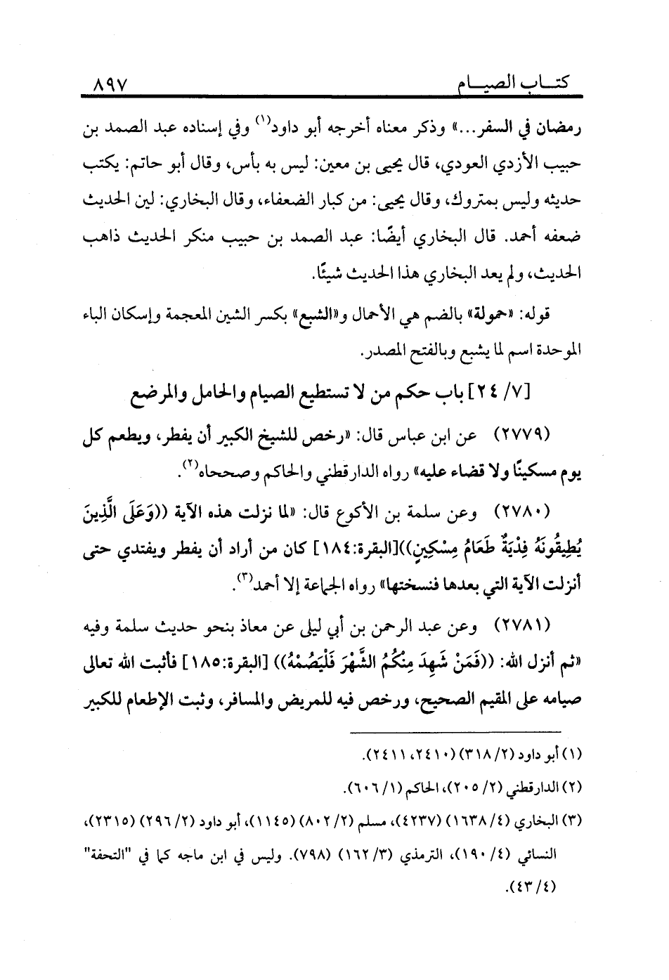 2781 - وعن عبد الرحمن بن أبي ليلى عن معاذ بنحو حديث سلمة وفيه «ثم أنزل الله: ((فَمَنْ شَهِدَ مِنْكُمُ الشَّهْرَ فَلْيَصُمْهُ)) [البقرة:185] فأثبت الله تعالى صيامه على المقيم الصحيح ورخص فيه للمريض والمسافر وثبت الإطعام للكبير