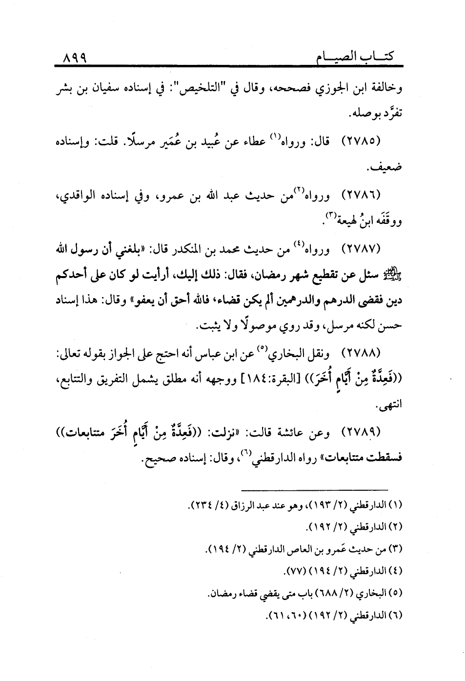 2789 - وعن عائشة قالت: «نزلت: ((فَعِدَّةٌ مِنْ أَيَّامٍ أُخَرَ)) [البقرة:184] متتابعات فسقطت متتابعات» رواه الدارقطني (¬5) ، وقال: إسناده صحيح.