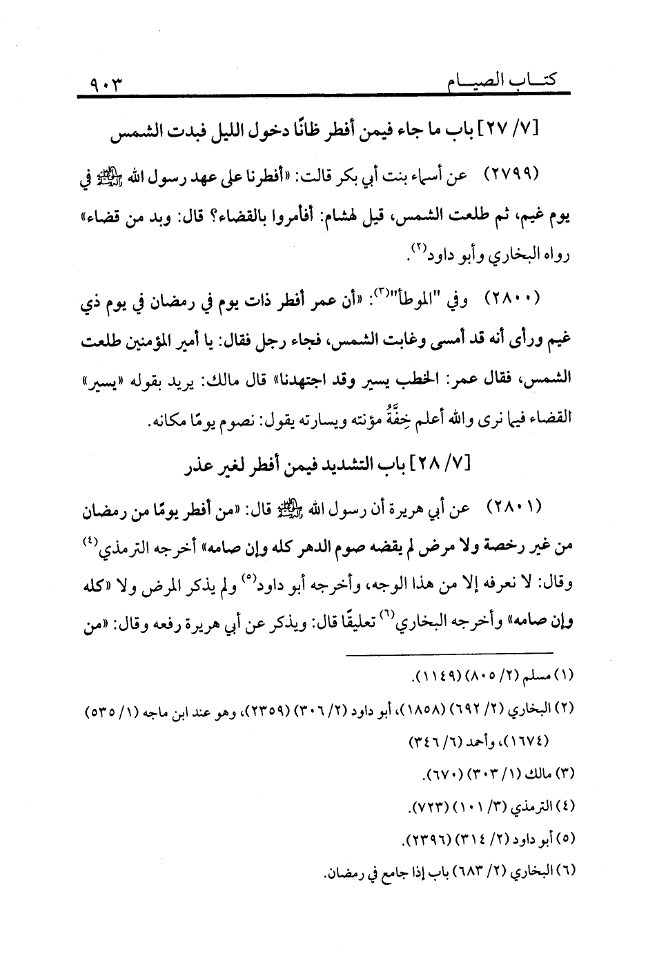 2799 - عن أسماء بنت أبي بكر قالت: «أفطرنا على عهد رسول الله - صلى الله عليه وسلم - في يوم غيم، ثم طلعت الشمس، قيل لهشام: أفأمروا بالقضاء؟ قال: وبد من قضاء» رواه البخاري وأبو داود (¬1) .