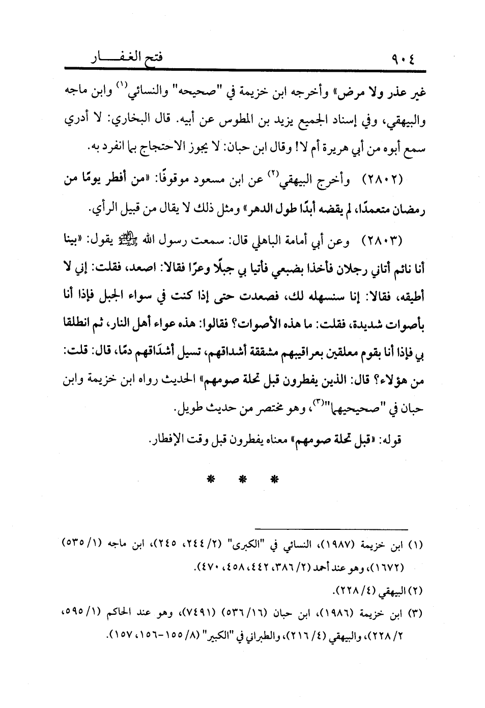 2803 - وعن أبي أمامة الباهلي قال: سمعت رسول الله - صلى الله عليه وسلم - يقول: «بينا أنا نائم أتاني رجلان فأخذا بضبعي فأتيا بي جبلًا وعرًا فقالا: اصعد، فقلت: إني لا أطيقه فقالا: إنا سنسهله لك، فصعدت حتى إذا كنت في سواء الجبل فإذا أنا بأصوات شديدة فقلت: ما هذه الأصوات؟ فقالوا: هذه عواء أهل النار ثم انطلقا بي فإذا أنا بقوم معلقين بعراقيبهم مشققة أشداقهم، تسيل أشدَاقهم دمًا، قال: قلت من هؤلاء؟ قال: الذين يفطرون قبل تحلة صومهم» الحديث رواه ابن خزيمة وابن حبان في "صحيحيهما" (¬3) ، وهو مختصر من حديث طويل.