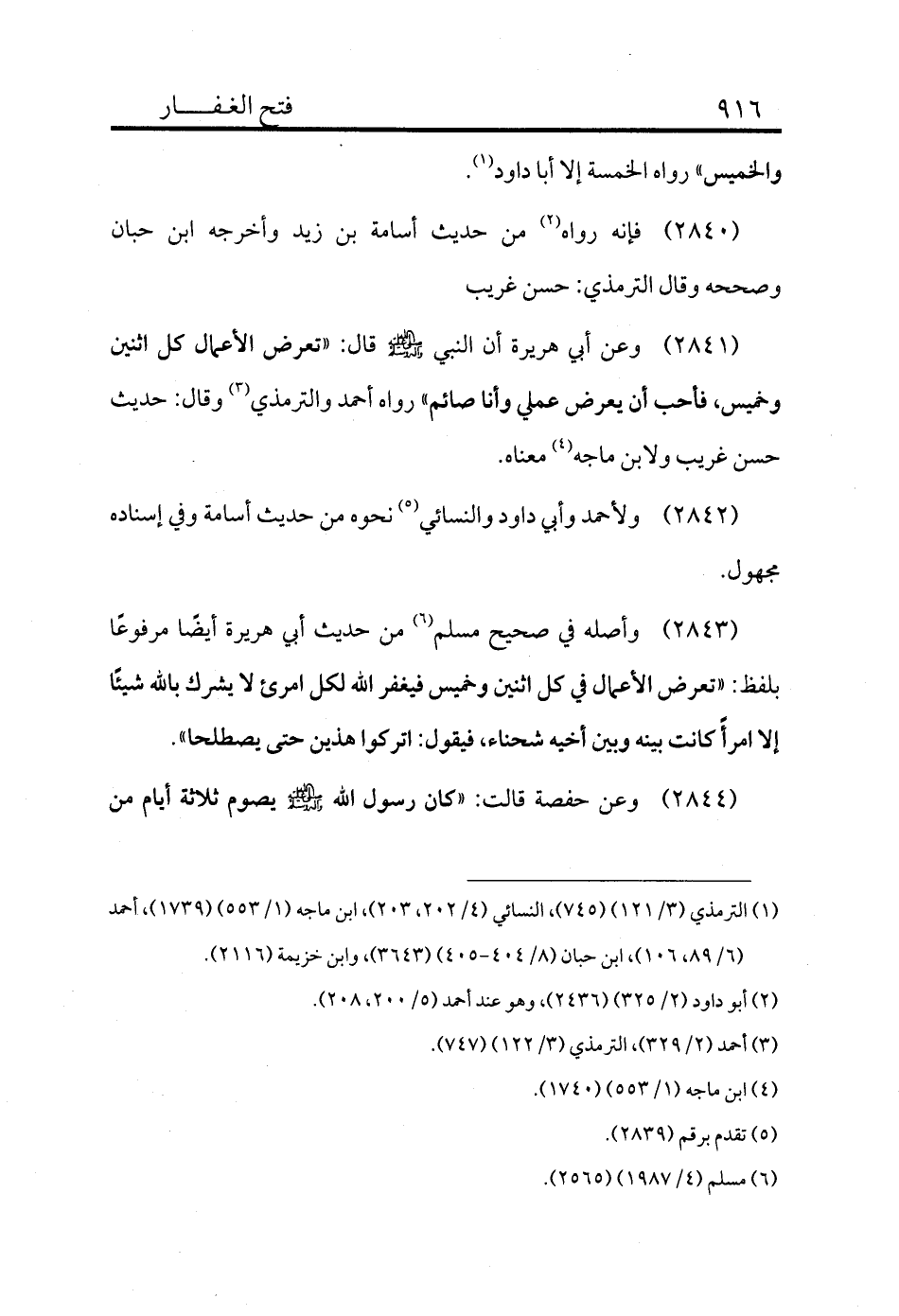 2841 - وعن أبي هريرة أن النبي - صلى الله عليه وسلم - قال: «تعرض الأعمال كل إثنين وخميس، فأحب أن يعرض عملي وأنا صائم» رواه أحمد والترمذي (¬3) وقال: حديث حسن غريب ولابن ماجه (¬4) معناه.