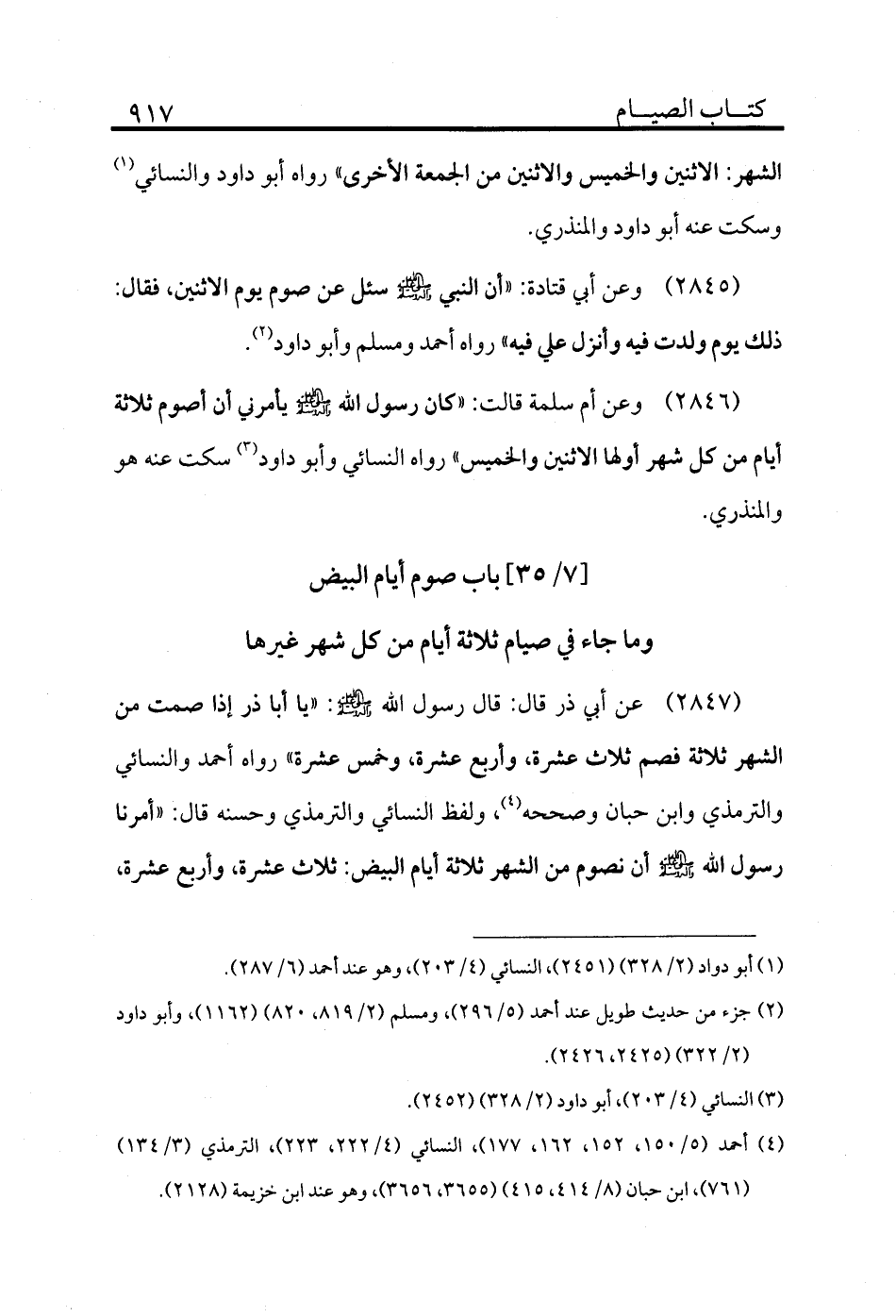 2846 - وعن أم سلمة قالت: «كان رسول الله - صلى الله عليه وسلم - يأمرني أن أصوم ثلاثة أيام من كل شهر أولها الإثنين والخميس» رواه النسائي وأبو داود (¬3) سكت عنه هو والمنذري.