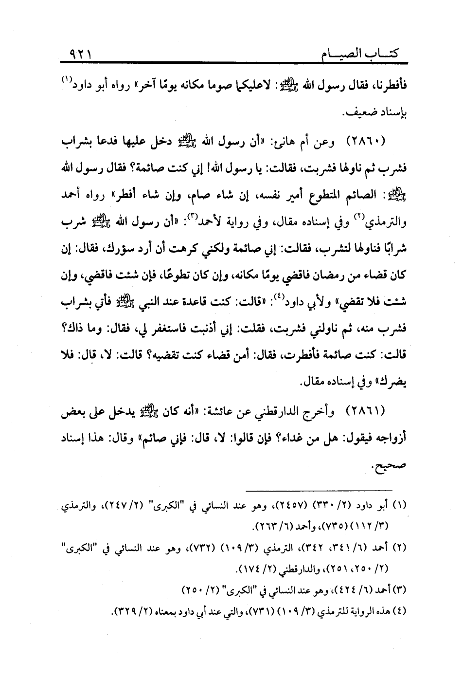 2860 - وعن أم هانئ: «أن رسول الله - صلى الله عليه وسلم - دخل عليها فدعا بشراب فشرب ثم ناولها فشربت فقالت: يا رسول الله! إني كنت صائمة؟ فقال رسول الله - صلى الله عليه وسلم -: الصائم المتطوع أمير نفسه، إن شاء صام، وإن شاء أفطر» رواه أحمد والترمذي (¬2) وفي إسناده مقال، وفي رواية لأحمد (¬3) : «أن رسول الله - صلى الله عليه وسلم - شرب شرابًا فناولها لتشرب، فقالت: إني صائمة ولكني كرهت أن أرد سؤرك، فقال: إن كان قضاء من رمضان فاقضي يومًا مكانه، وإن كان تطوعًا، فإن شئت فاقضي، وإن شئت فلا تقضي» ولأبي داود (¬4) : «قالت: كنت قاعدة عند النبي - صلى الله عليه وسلم - فأتي بشراب فشرب منه، ثم ناولني فشربت، فقلت: إني أذنبت فاستغفر لي، فقال: وما ذاك؟ قالت: كنت صائمة فأفطرت، فقال: أمن قضاء كنت تقضيه؟ قالت: لا، قال: فلا يضرك» وفي إسناده مقال.