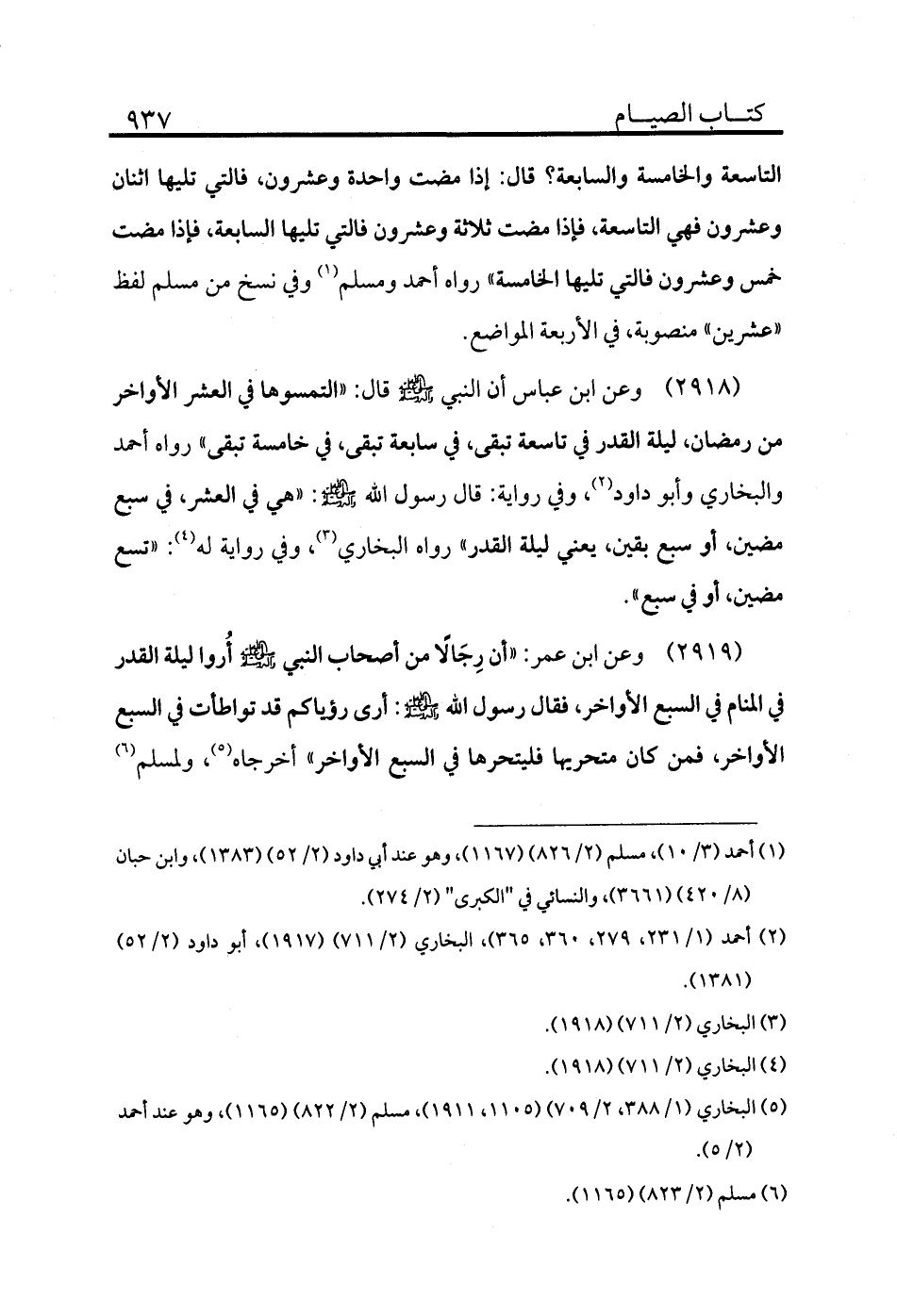 2918 - وعن ابن عباس أن النبي - صلى الله عليه وسلم - قال: «التمسوها في العشر الأواخر من رمضان، ليلة القدر في تاسعة تبقى، في سابعة تبقى، في خامسة تبقى» رواه أحمد والبخاري وأبو داود (¬2) ، وفي رواية: قال رسول الله - صلى الله عليه وسلم -: «هي في العشر في سبع مضين أو سبع بقين يعني ليلة القدر» رواه البخاري (¬3) ، وفي رواية له (¬4) : «تسع مضين أو في سبع» .