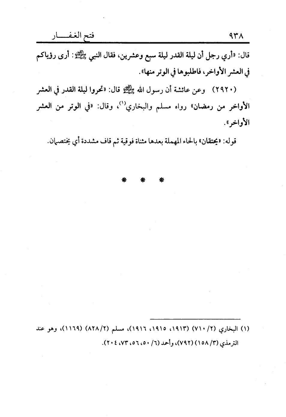 2920 - وعن عائشة أن رسول الله - صلى الله عليه وسلم - قال: «تحروا ليلة القدر في العشر الأواخر من رمضان» رواه مسلم والبخاري (¬1) ، وقال: «في الوتر من العشر الأواخر» .