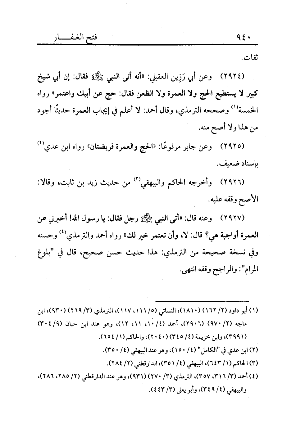 2927 - وعنه قال: «أتى النبي - صلى الله عليه وسلم - رجل فقال: يا رسول الله! أخبرني عن العمرة أواجبة هي؟ قال: لا، وأن تعتمر خير لك» رواه أحمد والترمذي (¬4) وحسنه وفي نسخة صحيحة من الترمذي: هذا حديث حسن صحيح، قال في "بلوغ المرام": والراجح وقفه انتهى.