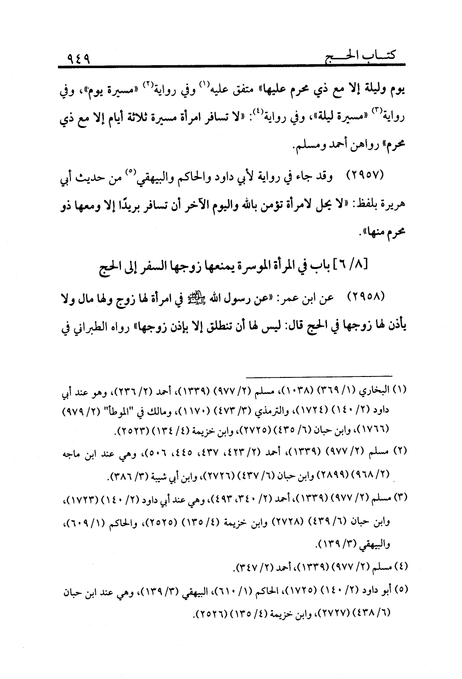 2957 - وقد جاء في رواية لأبي داود والحاكم والبيهقي (¬5) من حديث أبي هريرة بلفظ: «لا يحل لامرأة تؤمن بالله واليوم الآخر أن تسافر بريدًا إلا ومعها ذو محرم منها» .
