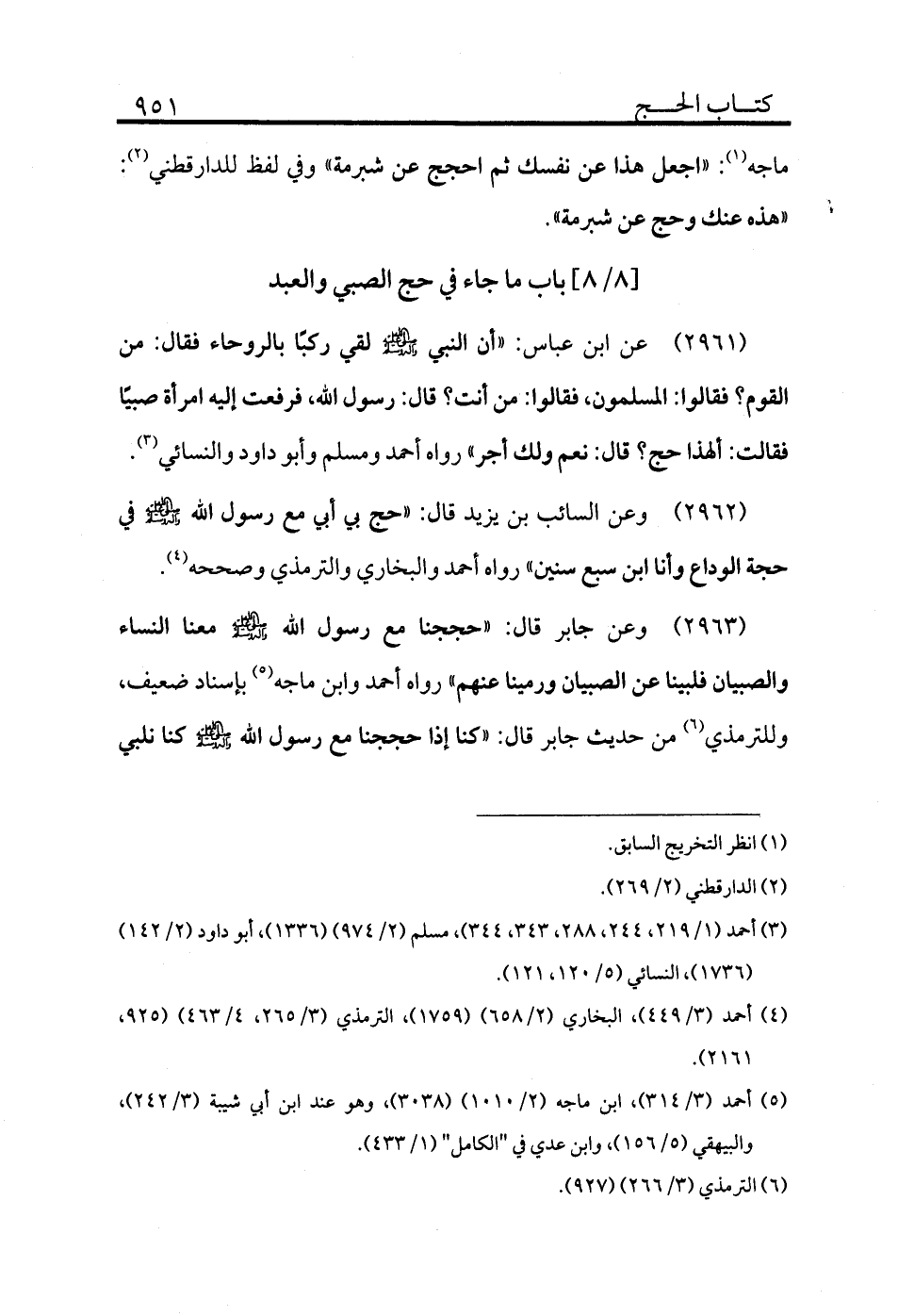 2961 - عن ابن عباس: «أن النبي - صلى الله عليه وسلم - لقي ركبًا بالروحاء فقال: من القوم؟ فقالوا: المسلمون، فقالوا: من أنت؟ قال: رسول الله، فرفعت إليه امرأة صبيًا فقالت: ألهذا حج؟ قال: نعم ولك أجر» رواه أحمد ومسلم وأبو داود والنسائي (¬3) .