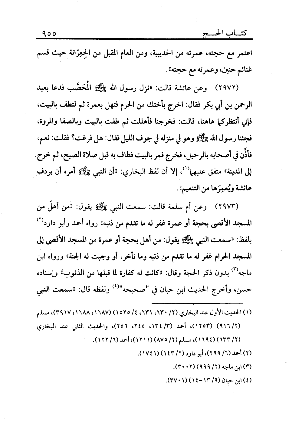 2972 - وعن عائشة قالت: «نزل رسول الله - صلى الله عليه وسلم - المُحَصَّب فدعا بعبد الرحمن بن أبي بكر فقال: اخرج بأختك من الحرم فتهل بعمرة ثم لتطف بالبيت فإني أنتظركما هاهنا، قالت: فخرجنا فأهللت ثم طفت بالبيت وبالصفا والمروة فجئنا رسول الله - صلى الله عليه وسلم - وهو في منزله في جوف الليل فقال: هل فرغت؟ فقلت: نعم، فأذَّن في أصحابه بالرحيل فخرج فمر بالبيت فطاف به قبل صلاة الصبح ثم خرج إلى المدينة» متفق عليهما (¬1) ، إلا أن لفظ البخاري: «أن النبي - صلى الله عليه وسلم - أمره أن يردف عائشة ويُعمِرَها من التنعيم» .